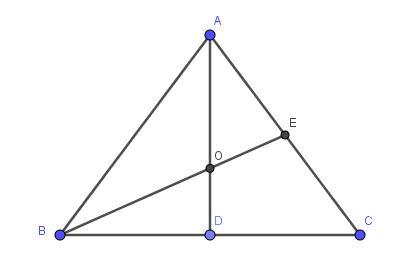 Высота AD, проведенная к основанию BC является биссектрисой и медианой. О - точка пересечения медиан. Медианы треугольника пересекаются в одной точке, которая делит каждую из них в отношении 2:1, начиная от вершины.