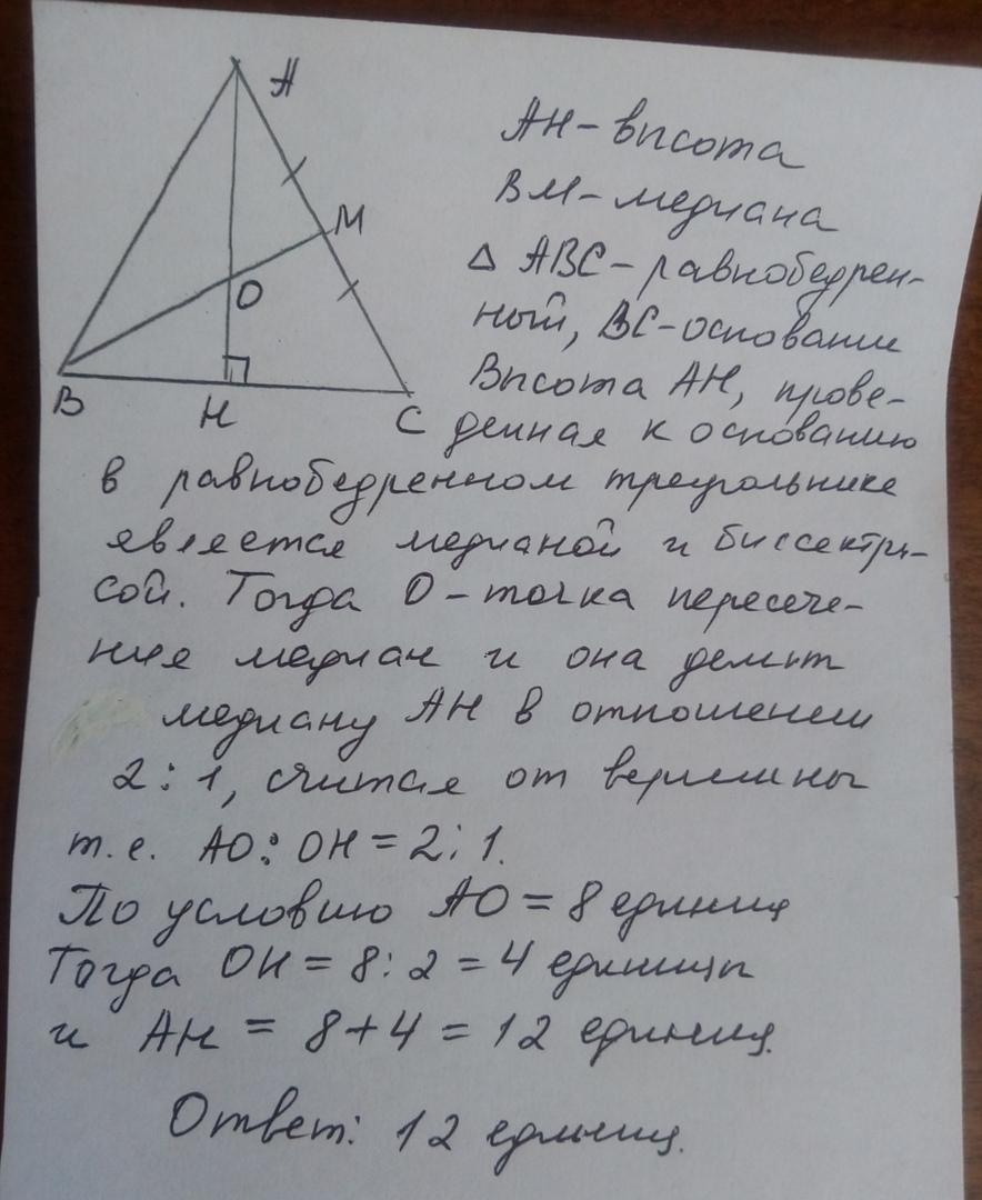 в треугольнике авс , ав = ас . медиана к боковой стороне делит высоту проведенную к основанию на отрезки больший из которых равен 8.найдите длину этой высоты