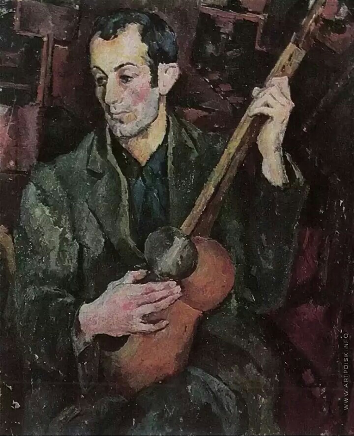 Мужчина лет 40. Напряженная поза. Пустой взгляд. Темные цвета и оттенки, символизирующие состояние мужчины и его усталость. Предположительно, уличный музыкант.
