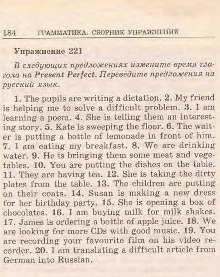 1 The pupils have written a dictation.2 My friend has helped me to solve a difficult problem.3 I have learnt a poem. 4 She has told them an interesting story. 5 Kate has swept the floor. 6 The waiter has put a bottle of lemonade in front of him. 7 I have eaten my breakfast. 8 We have drunk water. 9 He has brought them some meat and vegetable .10 You have put the dishes on the table. 11 They have had tea. 12 She has taken the dirty plates from table. 13 Children have put on their coats. 14 Susan has made a new dress. 15 She has opened a box of chocolates. 16 I have bought milk for milk shake.17 James has ordered a bottle of apple juice.18 We have looked for more CDs with good music. 19 You have recorded your favourite film on his video recorder.20 I have translated a difficult article from German to Russian.