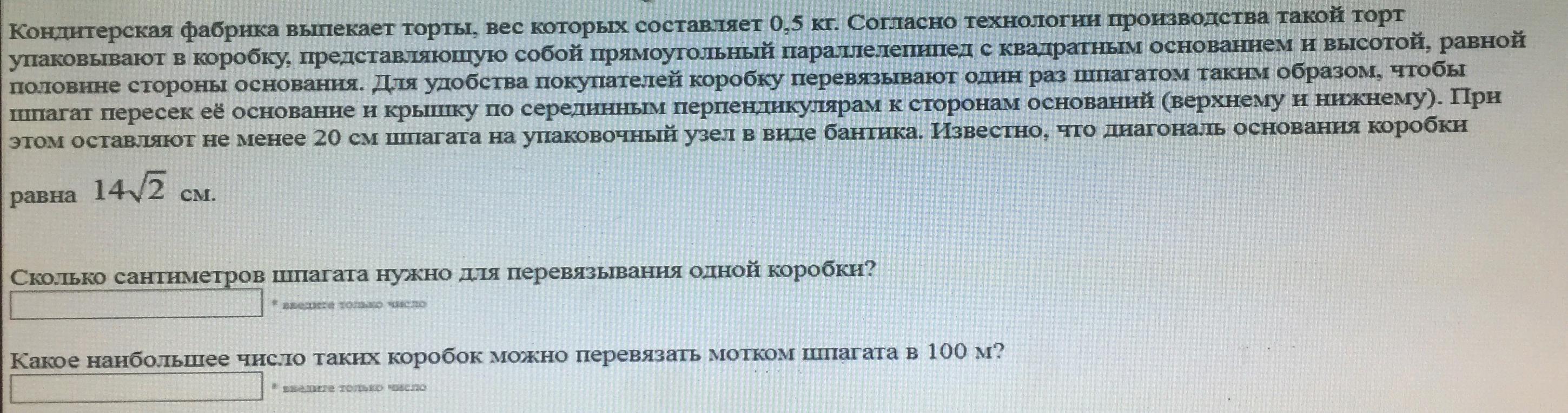 Кондитерская фабрика выпекает торты, вес которых составляет 0,5 кг. Согласно технологии производства такой торт упаковывают в коробку, представляющую собой прямоугольный параллелепипед с квадратным основанием и высотой, равной половине стороны основания. Для удобства покупателей коробку перевязывают один раз шпагатом таким образом, чтобы шпагат пересек её основание и крышку по серединным перпендикулярам к сторонам оснований (верхнему и нижнему). При этом оставляют не менее 20 см шпагата на упаковочный узел в виде бантика. Известно, что диагональ основания коробки равна см. Сколько сантиметров шпагата нужно для перевязывания одной коробки? * введите только число Какое наибольшее число таких коробок можно перевязать мотком шпагата в 100 м? * введите только число