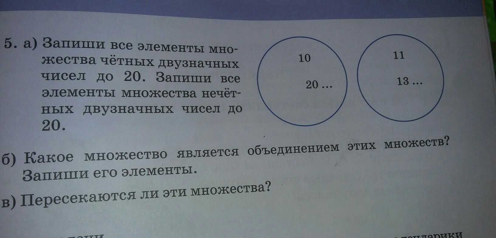 а)Запиши все элементы множества четырёх двухзначных чисел до 20. Запиши все элементы множества нечетных двузначных чисел до 20. б) Какио множество является объединением этих множеств Запиши его элементы. в)пересекаются ли эти множества