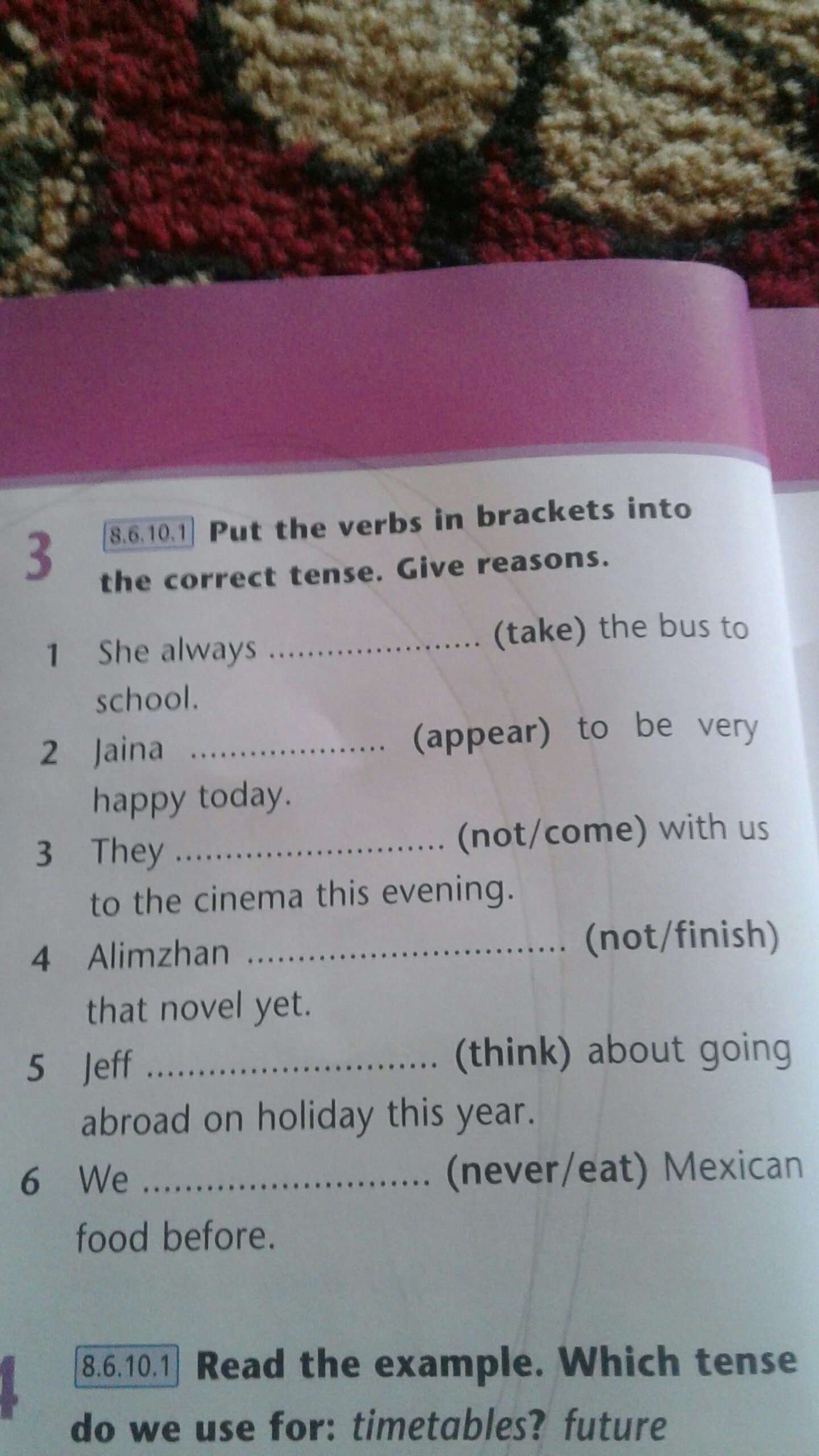 1 takes 2 appears 3 aren’t coming 4 hasn’t finished 5 is thinking 6 have never eaten