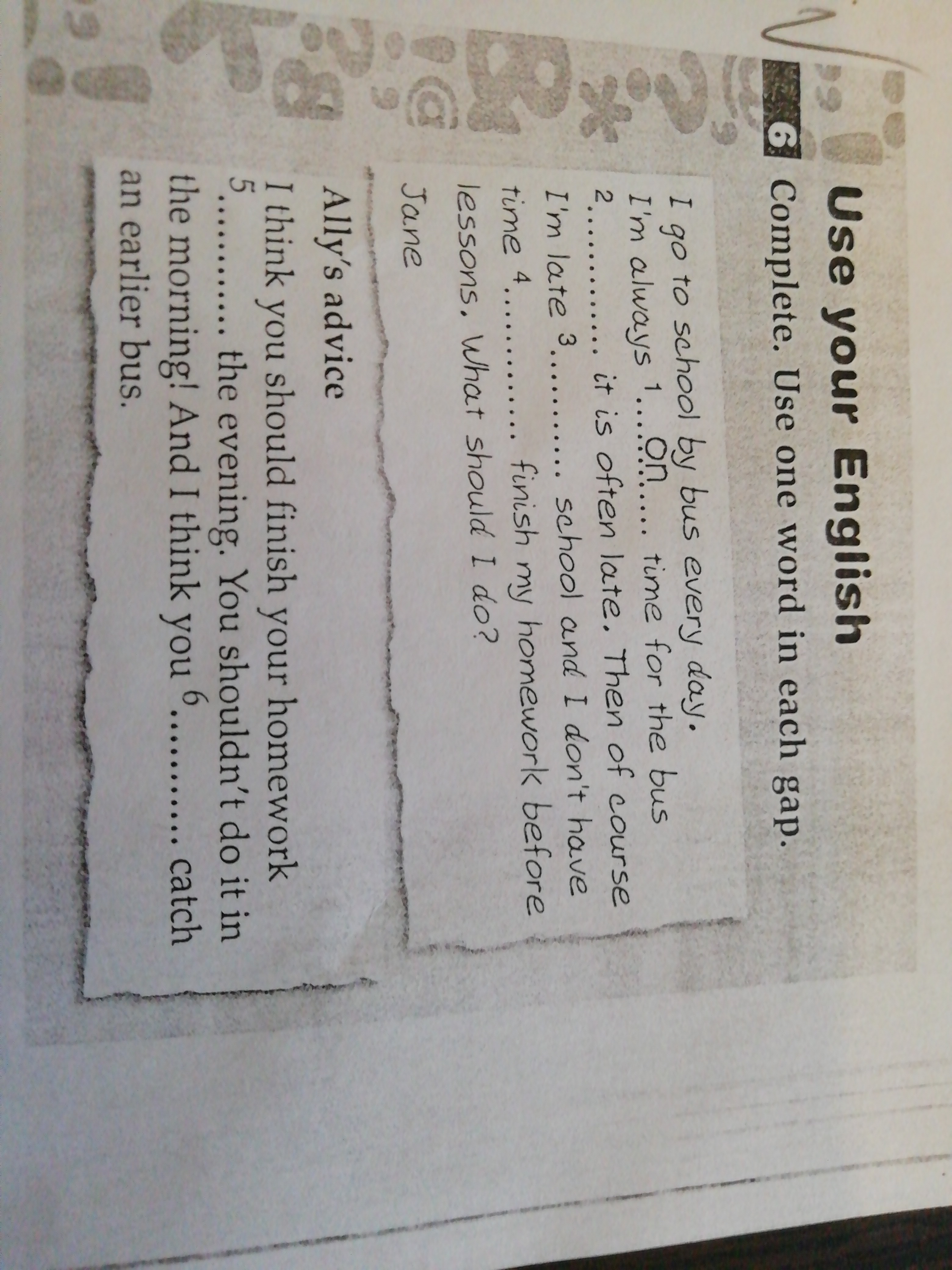 I`m always on time forthe bus but it is often late. Than of course i`m late to school and i don`t have time to finish my homework before lessons. What should i do ?