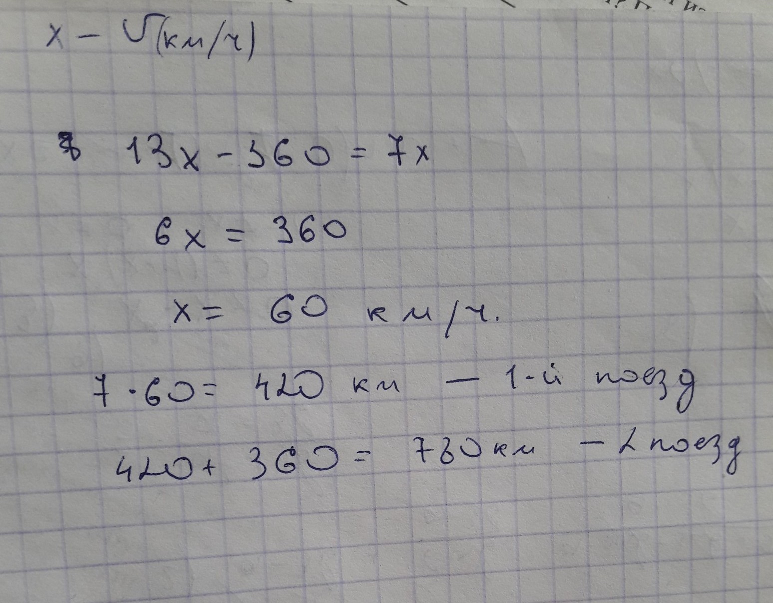один поезд находился в пути 7ч а второй 13 ч . второй поезд проехал на 360 км больше чем первый . сколько км проехал каждый поезд если они двигались с одинаковой скоростью?