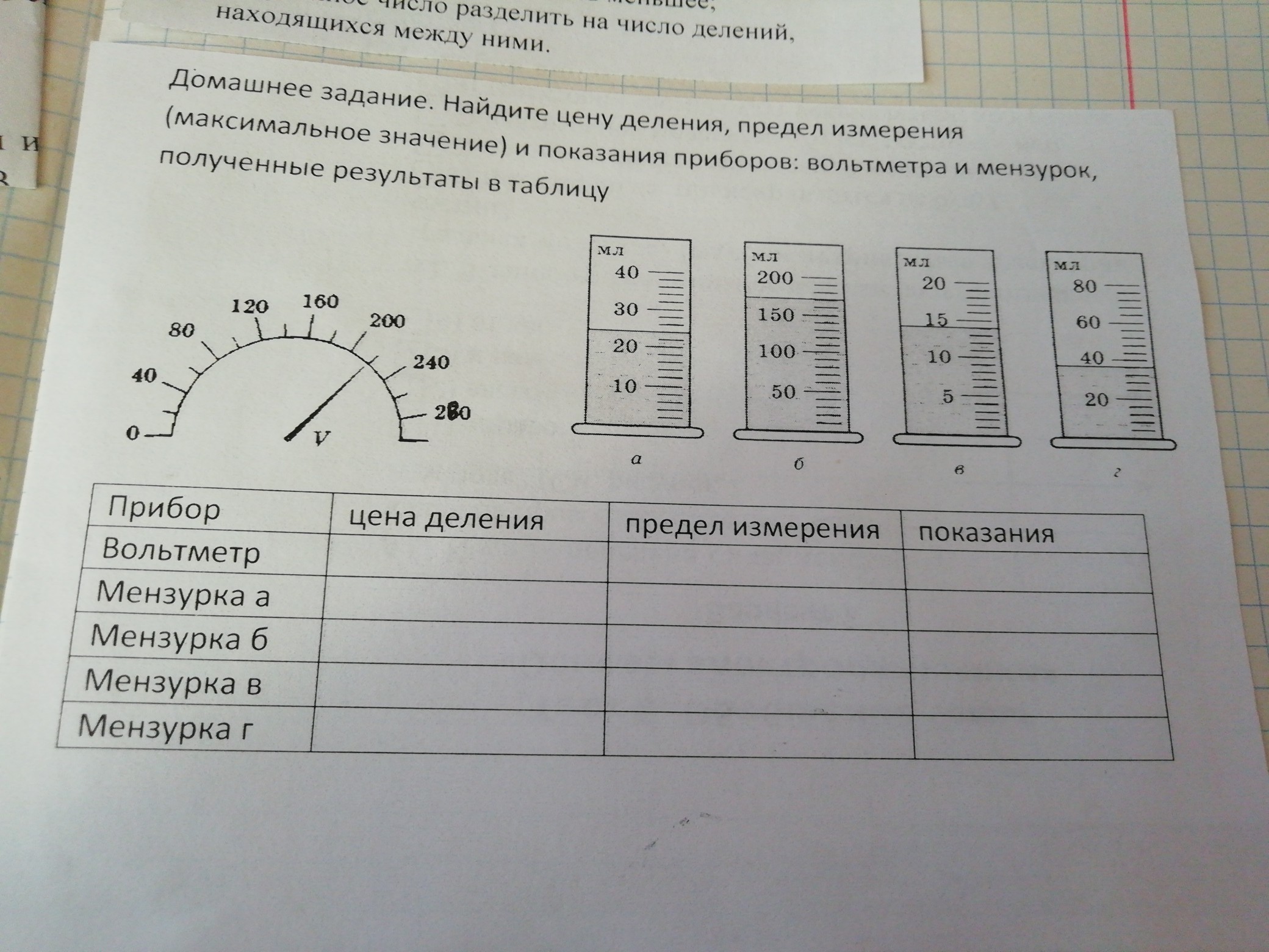Цену деления по примеру ты посчитай.Показание приборов надеюсь ты сам сможешь посчитать. И записать это все в таблицу...