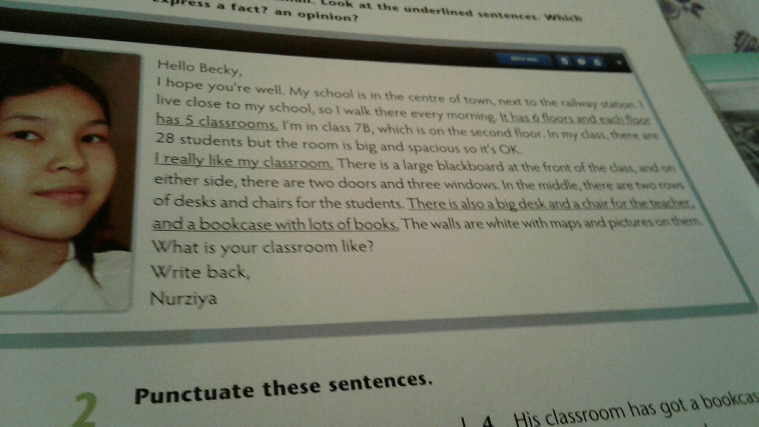 Привет Бекки, надеюсь, что ты в порядке. Моя школа расположена в центре города, рядом с железнодорожным вокзалом. Я живу рядом с моей школой, поэтому каждое утро я иду туда. В школе 6 этажей и на каждом этаже по 5 классных комнат. Я в 7Б классе, который расположен на втором этаже. В моем классе 28 учеников, но помещение большое и просторное, поэтому все хорошо.
