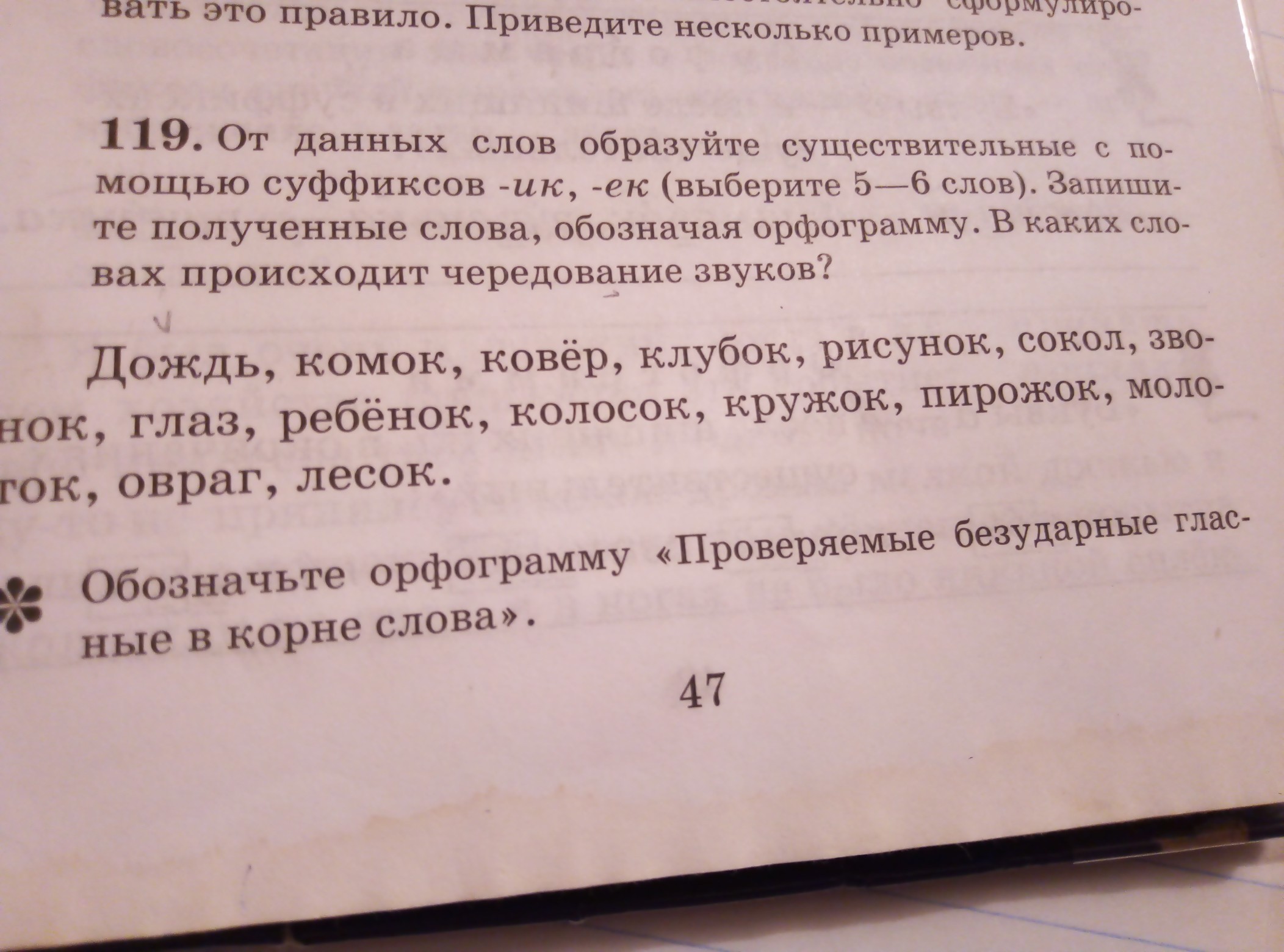 Дождик, комочек, коврик, клубочек, рисуночек, соколик, звоночек, глазик, ребёночек, колосочек, кружочек, пирожочек, молоточек, овражек, лесочек.