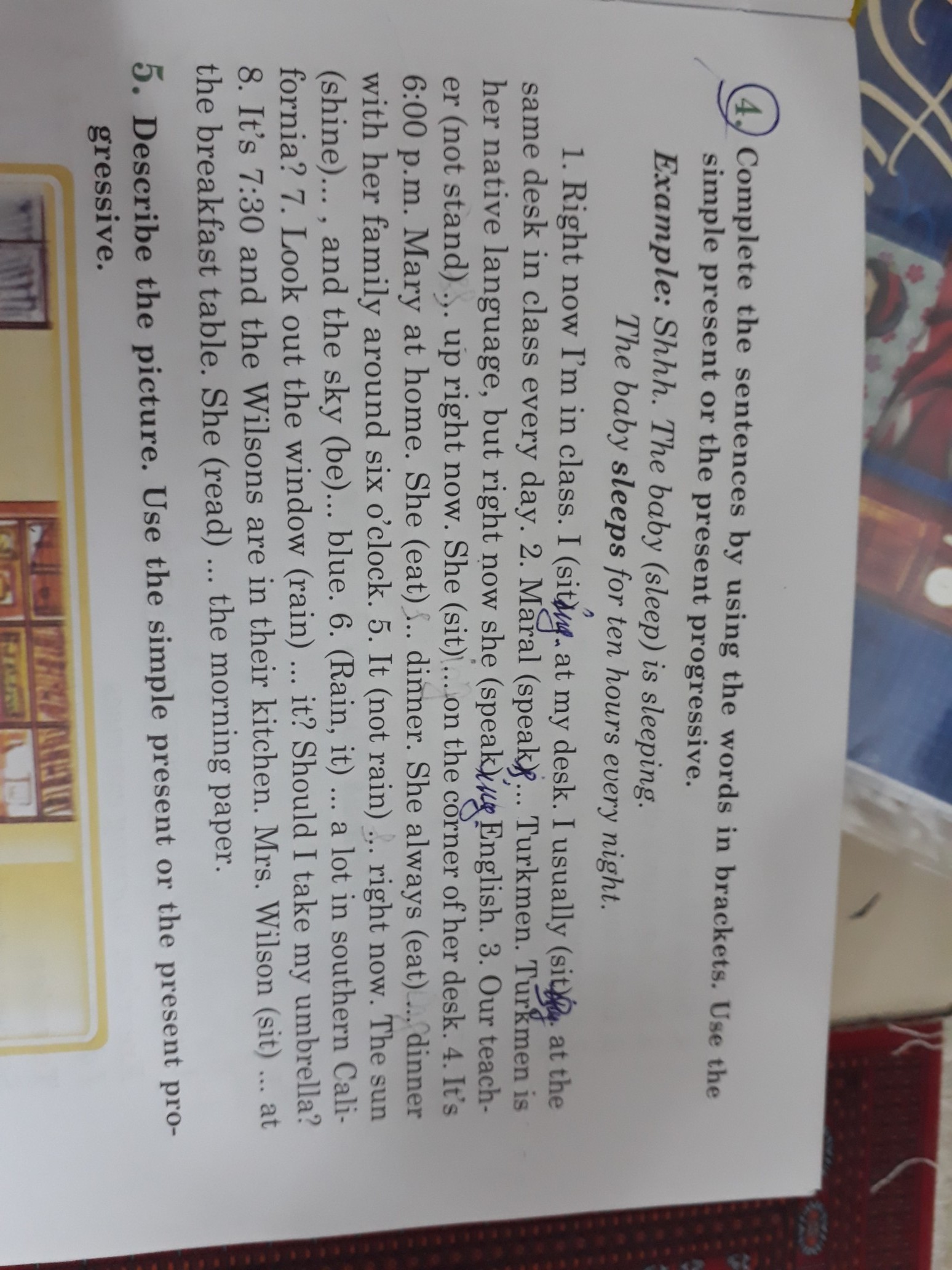 1 am sitting -sit , 2 speaks -is speaking, 3 isn’t standing-is sitting ,4 is eating-eats , 5 isn’t raining-is shining-is, 6 Does it rain , 7 is it raining , 8 is sitting-is reading.