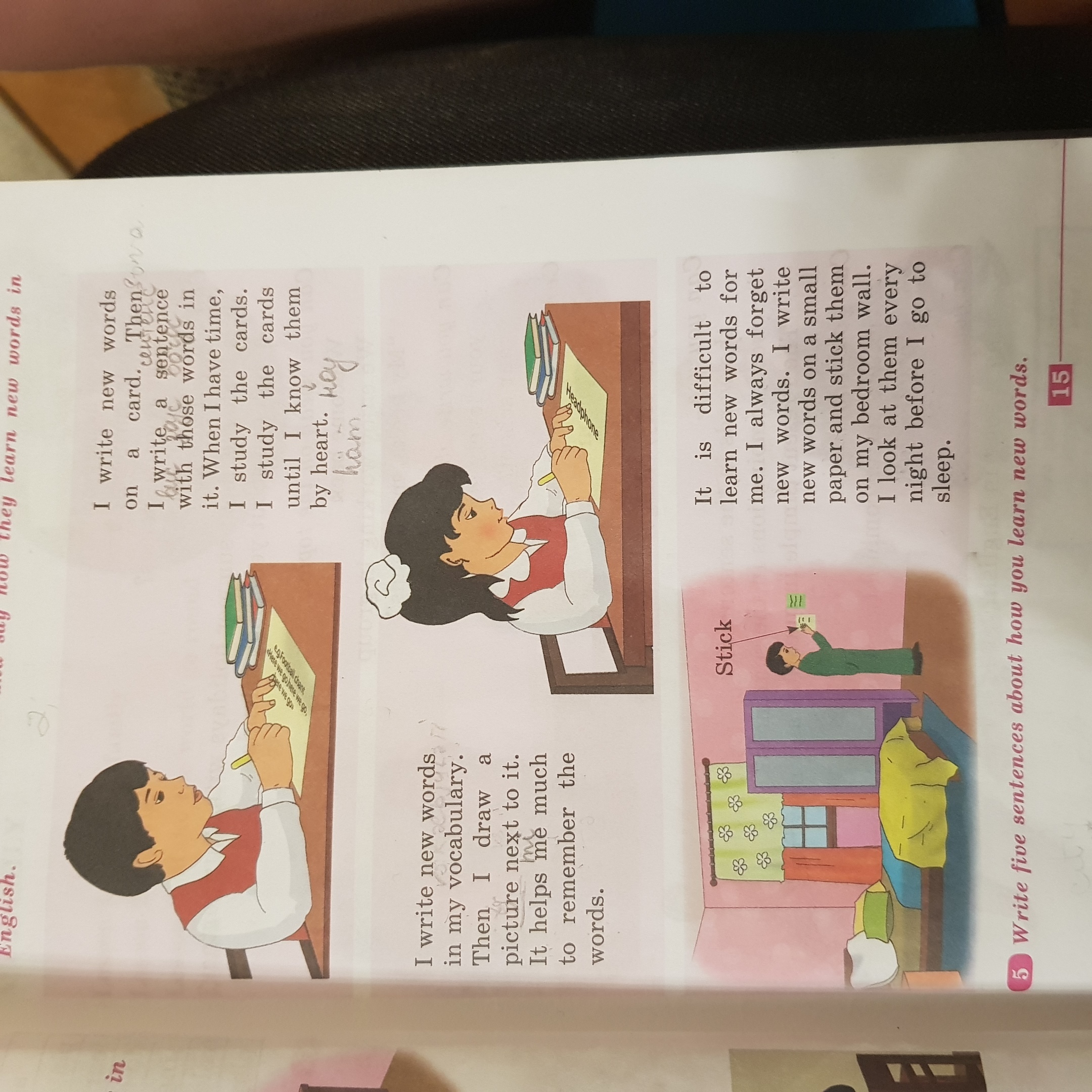 Я пишу новые слова на карточке. Тогда я пишу предложение с этими словами в нем. Когда у меня есть время, я изучаю карточки. Я изучаю карты, пока не узнаю их сердце.