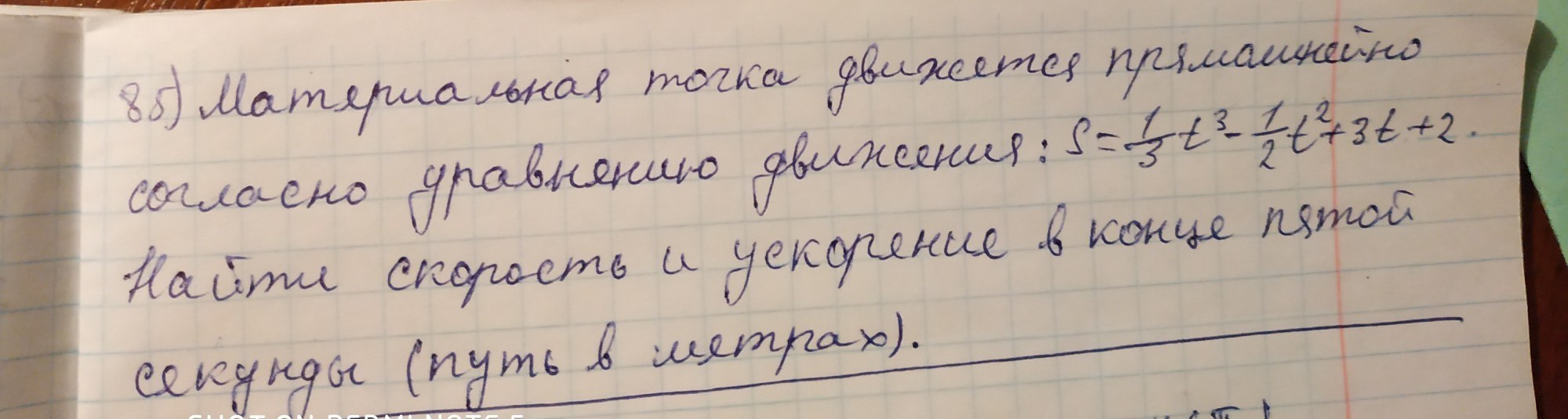 материальная точка движения прямолинейно согласно уравнению движения: S=⅓t³-½t²+3t+2. Найти скорость и ускорение в конце пятой секунды в (пути в метрах)
