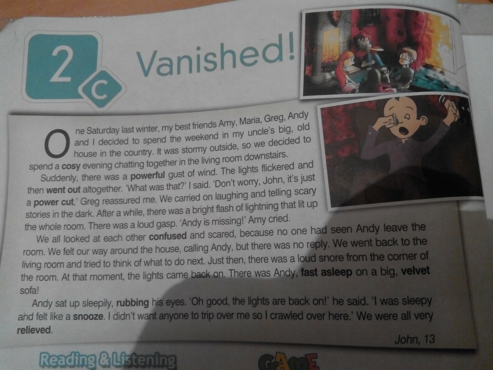 Мы все посмотрели друг на друга смущенно и испуганно, потому что никто не видел, как Энди покидает комнату. Мы вернулись в общую комнату и попытались подумать над тем, что делать дальше. Именно в тот момент из угла комнаты послышалось громкое храпение. В тот момент снова включился свет. На большом вельветовом диване крепко спал Энди!