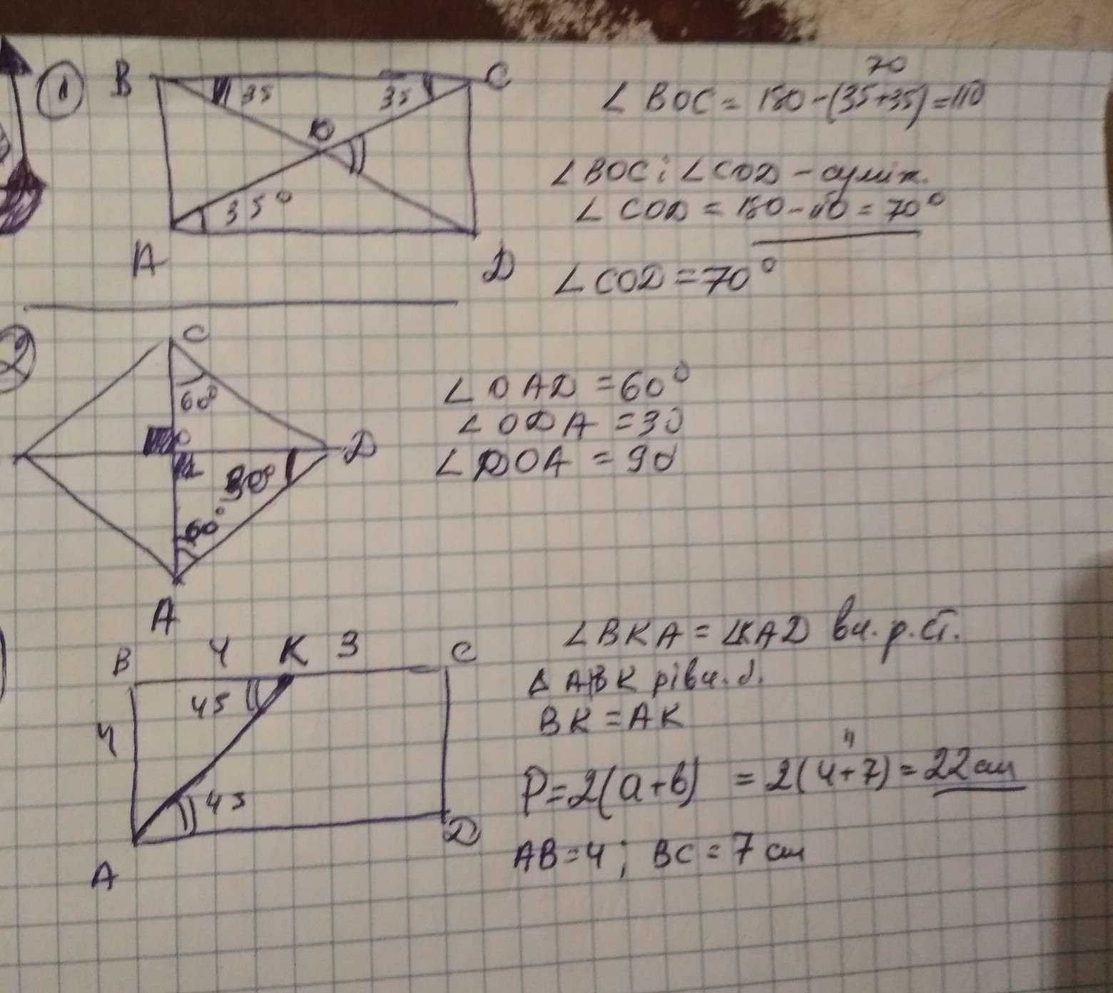 1.Знайдіть гострий кут між діагоналями прямокутника якщо його діагональ утворює зі стороною кут 35* . 2.знайдіть периметр ромба якщо його сторона утворює з діагоналлю кут 60*. 3.Бісектриса кута А прямокутника АВСD ділить сторону ВС на частини 3см і 4см, починаючи від вершини С. Знайти периметр прямокутника