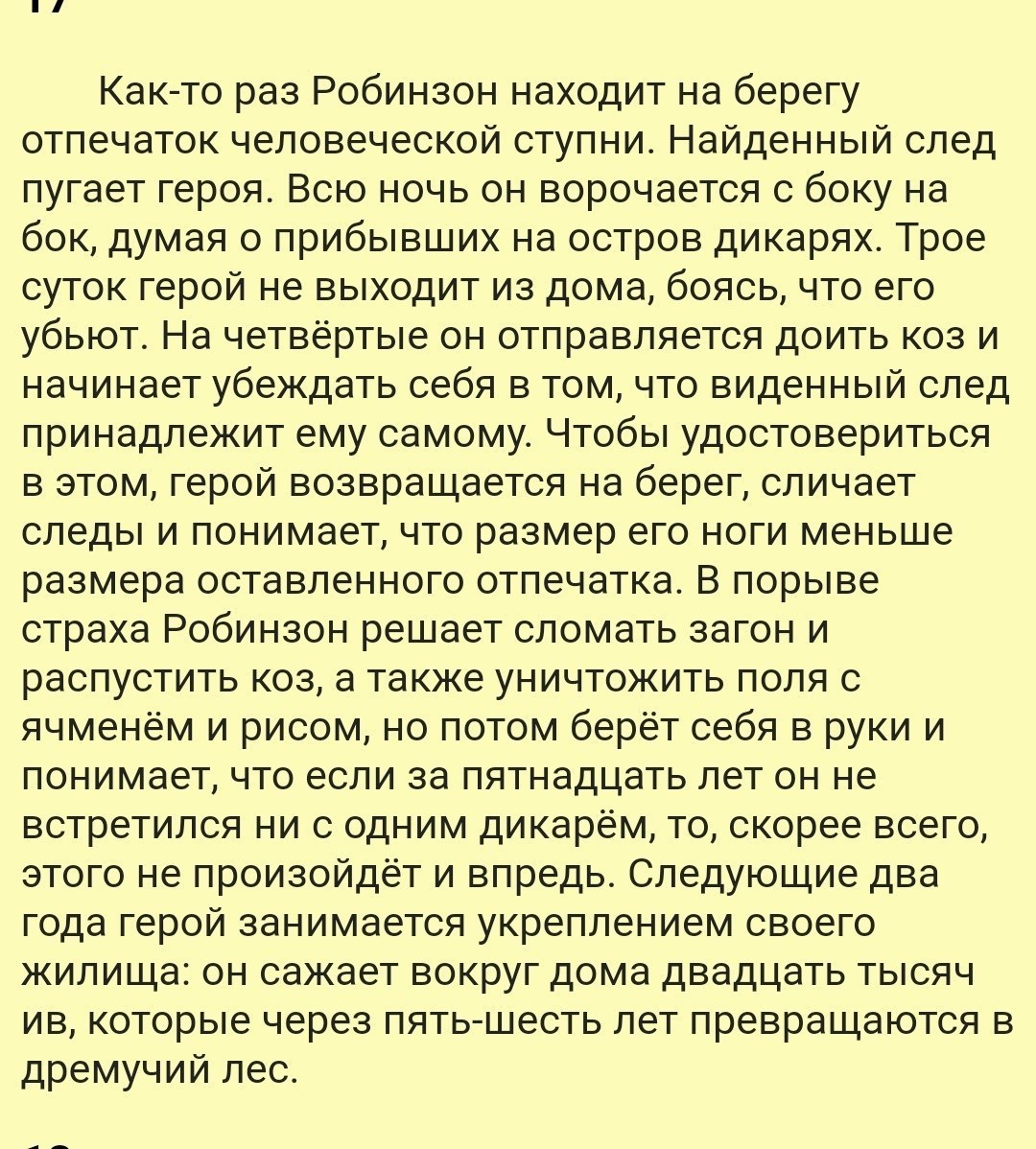Бірде, Робинсон жағасында адамның табанының ізі табылды. Табылған ізі батырды қорқытады. Түні бойы ол аралға кірген қасқыр туралы ойлап, жағаға қарай бет бұрып, үш күн бойы батырдың үйден кетпей, өлтірілетінін біледі. Төртіншіден, ол ешкі сүтке барып, көзге көрінетін із оған тиесілі екеніне көз жеткізе бастайды. Мұны растау үшін кейіпкерлер жағаға қайтады, іздерімен салыстырады және аяғының өлшемі сол жақтан басып шығару өлшемінен аз екенін түсінеді. Қорқынышқа бой алдырған Робинсон калемді сындырып, ешкілерді сындырып, арпа мен күрішпен жойып жібереді деп шешеді, бірақ содан кейін бір-біріне жақындай түседі және он бес жылда кез-келген қасқырмен кездеспеген болса, онда бұл болмайды. бұдан әрі Келесі екі жылда кейіпкер өз үйін нығайтумен айналысады: бес-алты жылдан кейін тығыз орманға айналатын үйдің айналасында жиырма мың тұқым өседі.