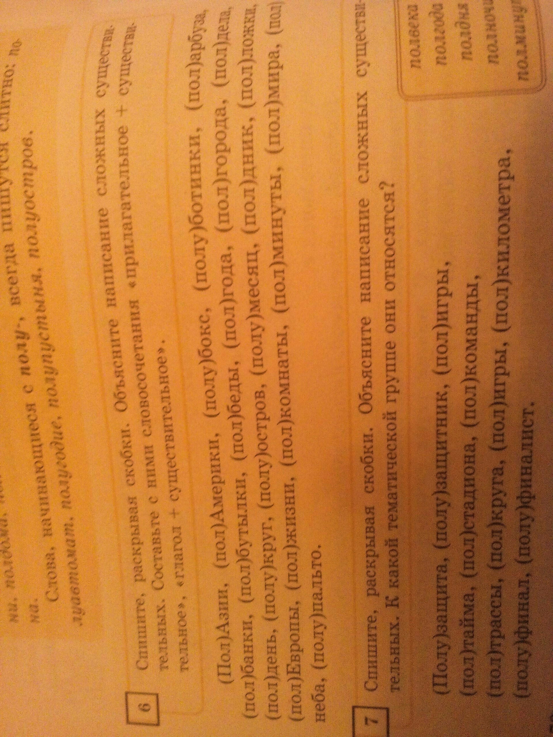 Пол-Азии, пол - Америки, полубокс, полуботинки, полбанки, полбутылки,полбеды, полгода, полдень, полукруг, полу - остров, полумесяц, полдник, пол - Европы, полжизни, полкомнаты, полминуты, полмира.