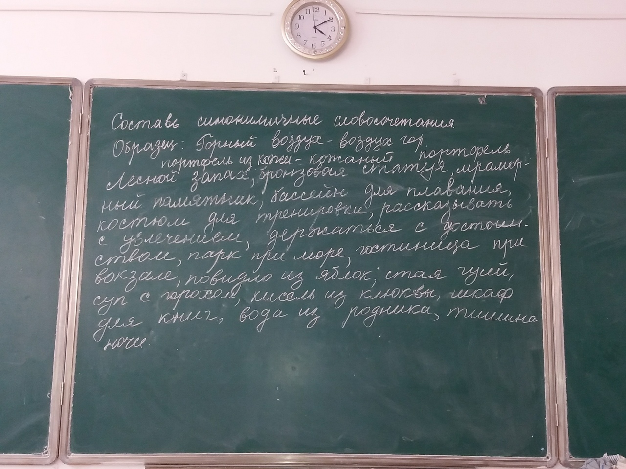 Лесной запах - запах леса. Бронзовая статуя - статуя из бронзы. Мраморный памятник - памятник из мрамора. Бассейн для плавания - плавательный бассейн. Костюм для тренировки - тренировочный костюм. Рассказывать с увлечением - увлекательный рассказ. Держаться с достоинством - достойно держаться. Парк при море - приморский парк. Гостиница при вокзале - привокзальная гостиница. Повидло из яблок - яблочное повидло. Стая гусей - гусиная стая. Суп с горохом - гороховый суп. Кисель из клюквы - клюквенный кисель. Шкаф для книг - книжный шкаф. Вода из родника - родниковая вода. Тишина ночи - ночная тишина.