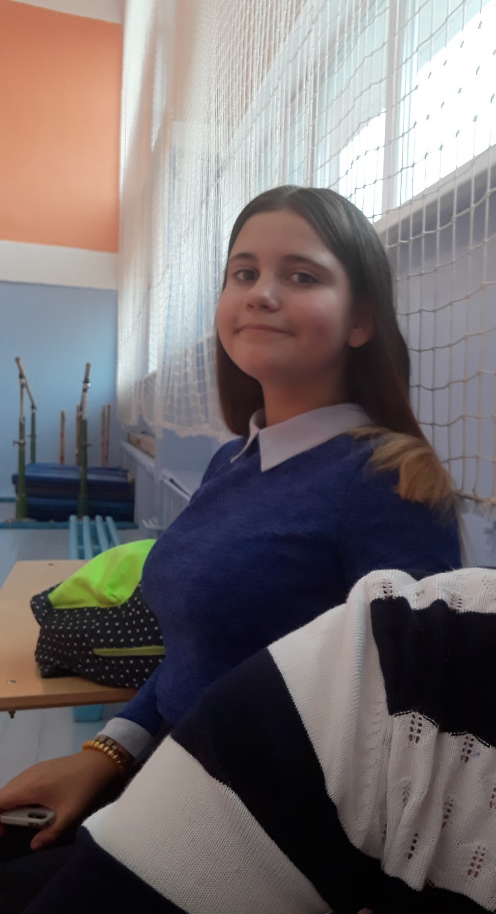 Со мной за партой сидит милая приятная девушка. Ее зовут......Обаятельной внешности, с прекрасными темными волосами, и карими глазами. Мягкая улыбка и задорный взгляд предают девушке детский и непринужденный облик. Круглое лицо и пухлые щеки делают девушку очень милой.
