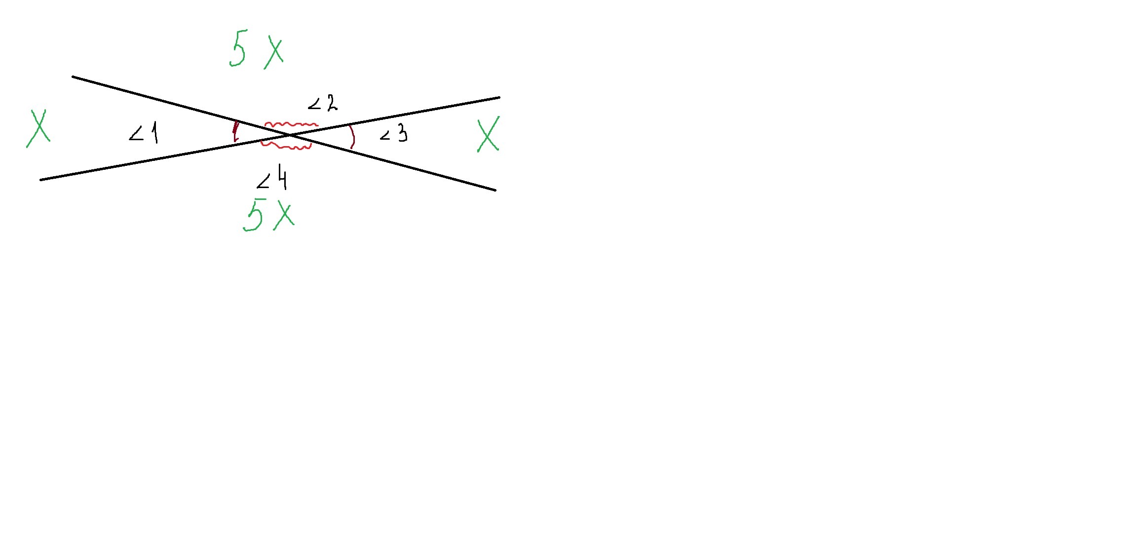 Один из углов , образовавшихся при пересечении двух прямых, в 5 раз больше другого . Найдите градусные меры всех углов.