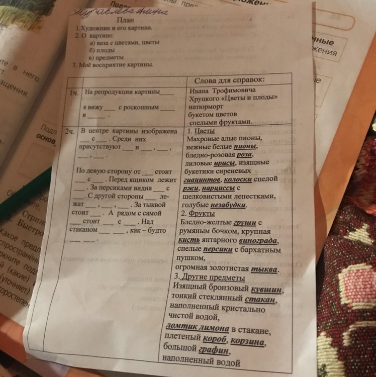 В центре картины изображена бледно-розовая роза с нежными белами пионами. Среди них присутствуют махровые алые пионы и лиловые ирисы,колоски спелой ржи,голубые незабудки нарциссы с шелковистыми лепестками.