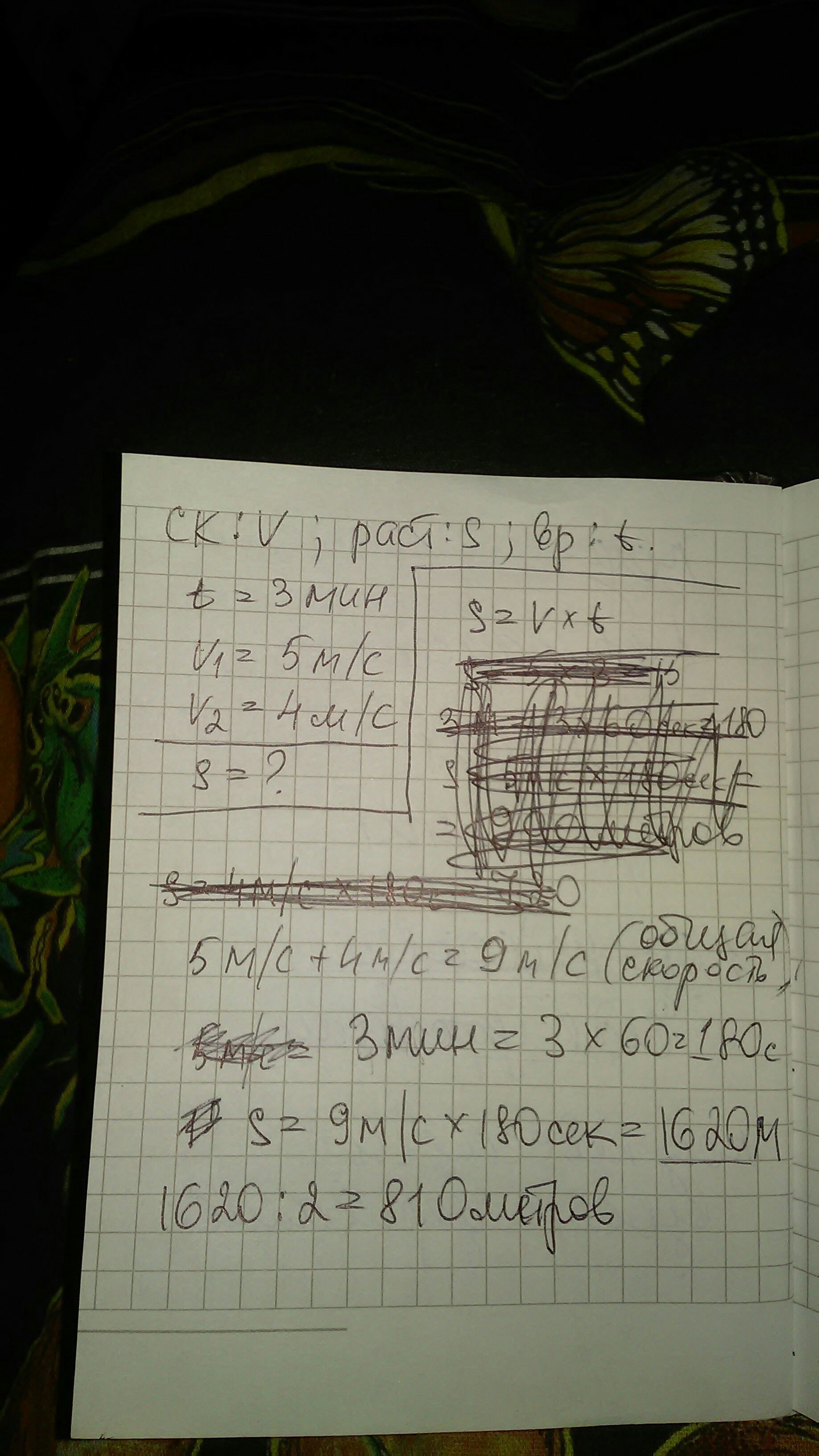 Карлсон за 3 минуты успевает долететь из домика до окна, скватить плюшки и вернуться в домик. Сколько метров от домика Карлсона окна, - -если скорость Карлсона налегке 5 м/с, а его скорость с плюшками 4 м /с