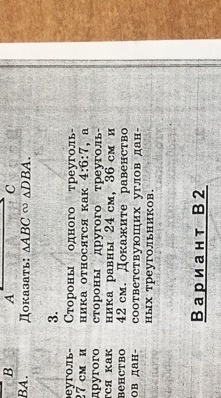 просто элементарно, во всех числах есть что-то общее, выбираешь за это общее число 6. оформление будет такое, если все стороны сократить на 6 , то мы получим ту же пропорцию , что дана на первый треугольник. таким образом пропорции равны, значит, треугольники равны соответственно.