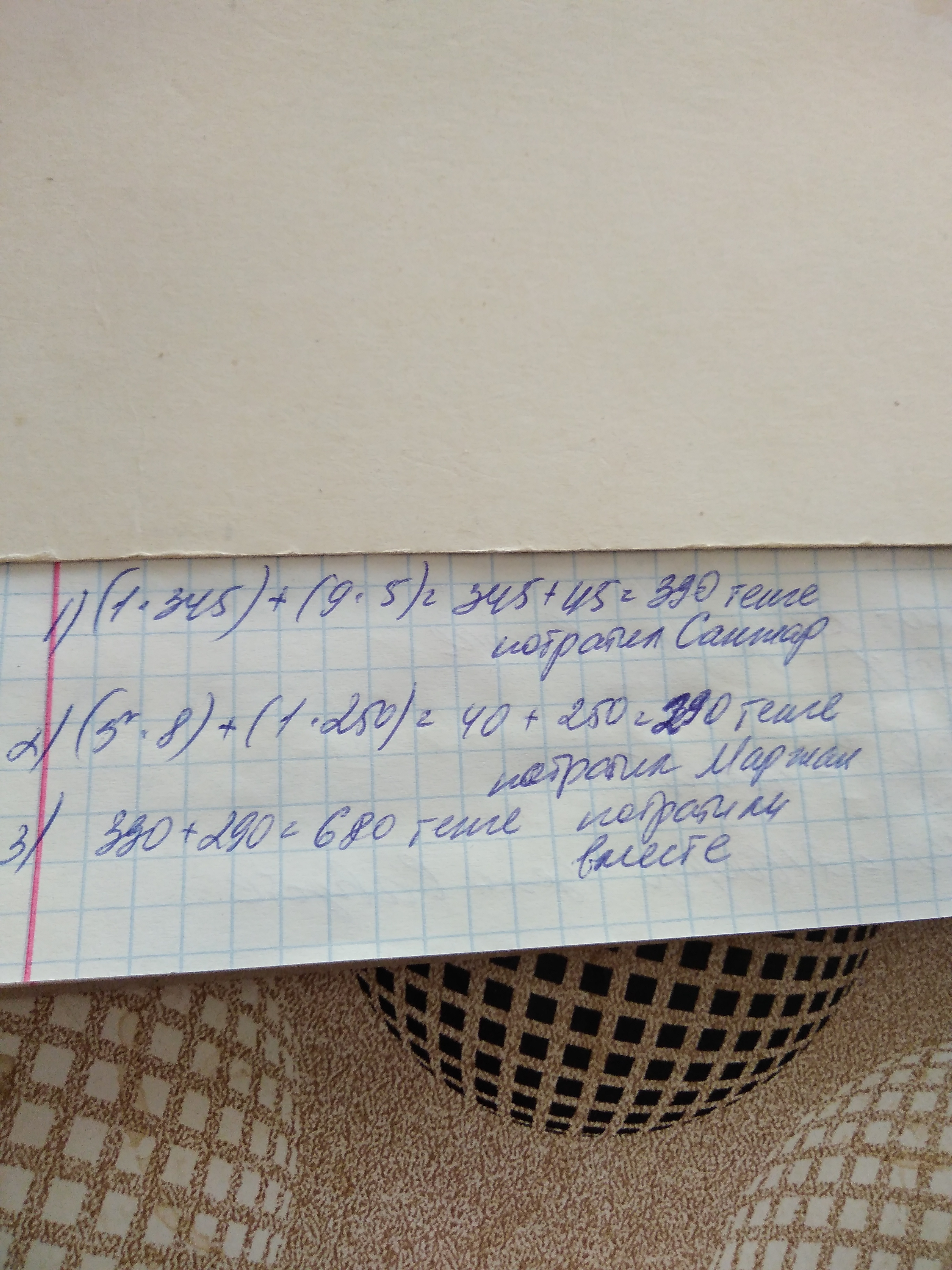 Санжар купил упаковку разовых стаканчиков за 345 тенге и 9 трубоочек по 5 тенге. А Маржан 5 ложечек по 8 тенге и упаковку салфеток за 250 тенге. Сколько денег они потратили вместе