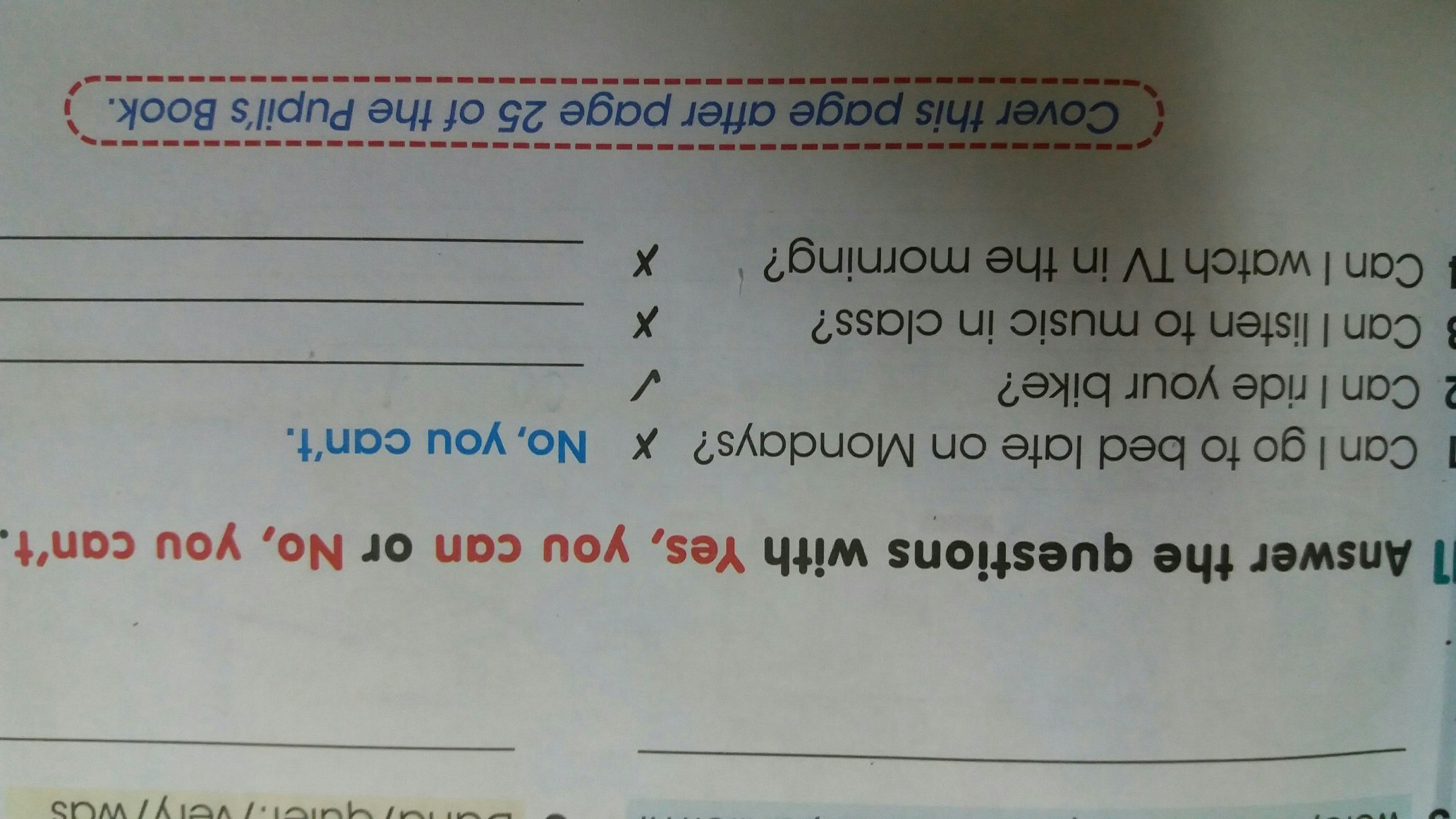 В ответах с "птичкой" нужно проставить Yes, you can, а с крестиком - No, you can't. Соответственно положительный ответ будет во 2м пункте, во всех отсальных - отрицательный.