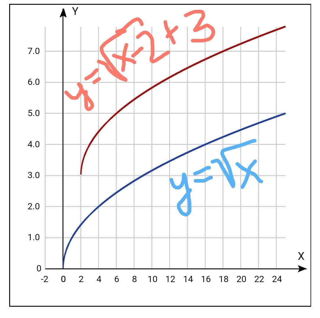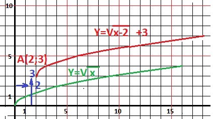 Второй график Y = √(x-2) + 3 получается переносом исходной точки графика √х в точку А(2;3) - по оси Х на два вправо и на 3 вверх.