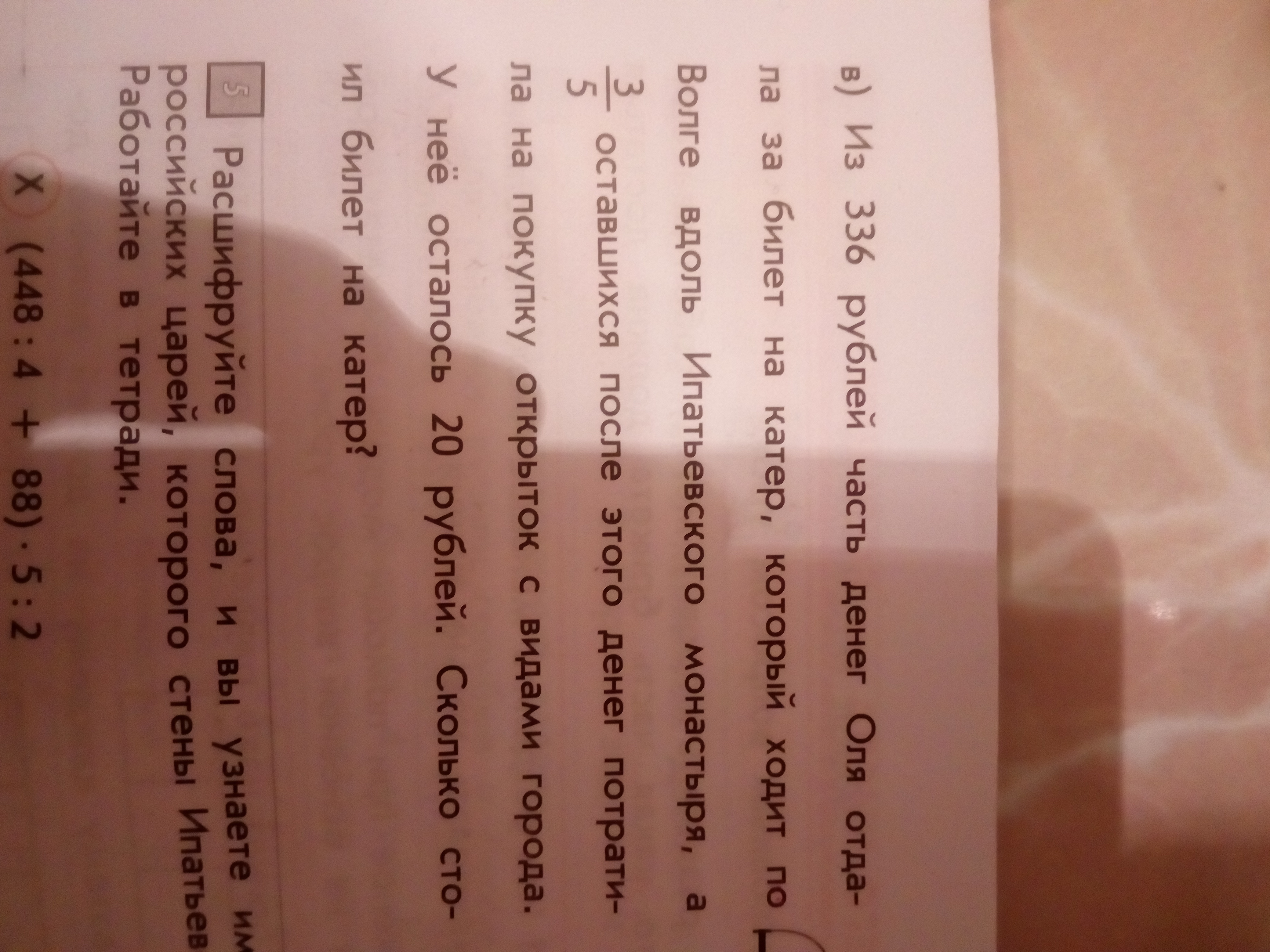 3/5 оставшихся потратила, осталось 20, или 2/5. То есть 5/5 - это 50. Значит, после покупки билета осталось 50. То есть сам билет стоил 336-50=286