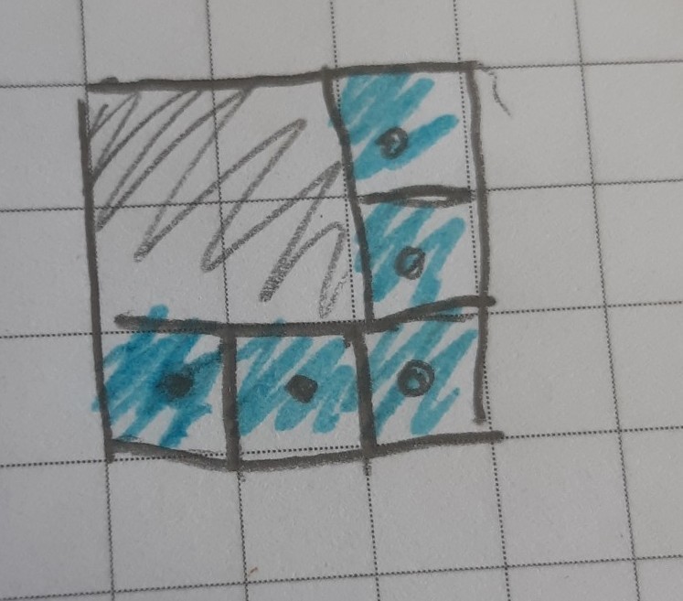 Большой мы можем поставить только в угол. Маленький по периметру. 5 свободных клеток, т е 5 возможных способов расположения двух квадратов. Плюс 4 раза мы можем перевернуть доску. 5×4=20 способов
