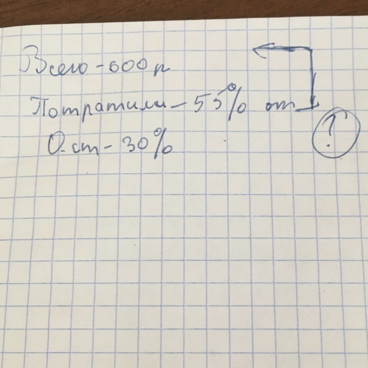 Товар стоит 600р потратили 55 процентов от всей сууммы.Осталось 30 процентов.Сколько осталось денег?СРОЧНОО