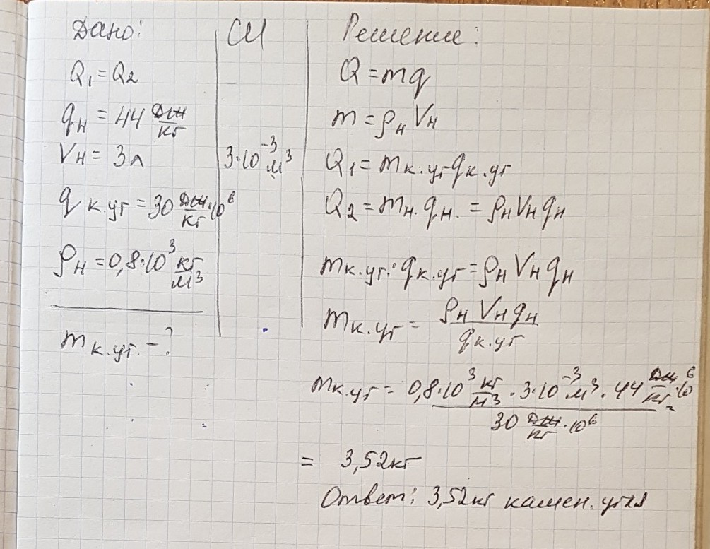 Сколько необходимо сжечь каменного угля, чтобы получить такое же количество теплоты, как и при сжигании нефти объемом 3 л?