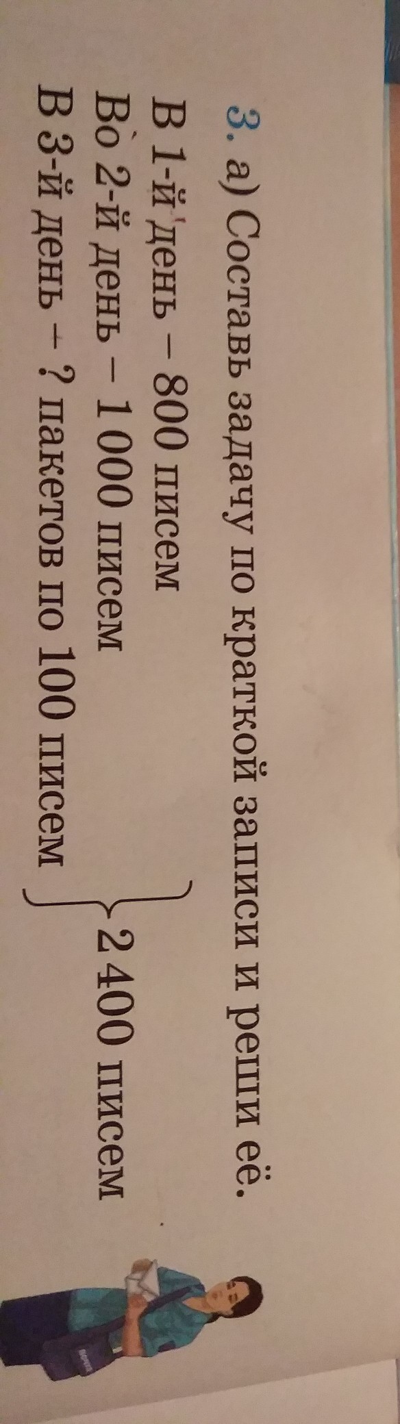 Всего нв почту пришло 2400 писем . В первый день 800 писем . во второй 1000 писем . сколько пакетов по 100 писем пришло в 3 день?