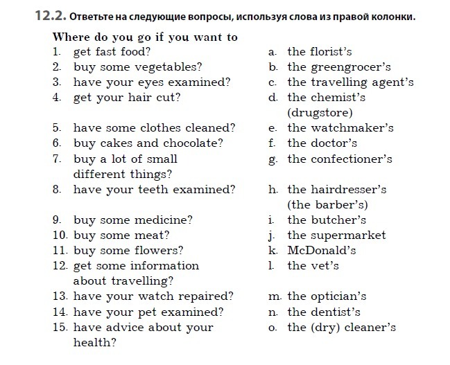 Ответьте на следующие вопросы, используя слова из правой колонки.