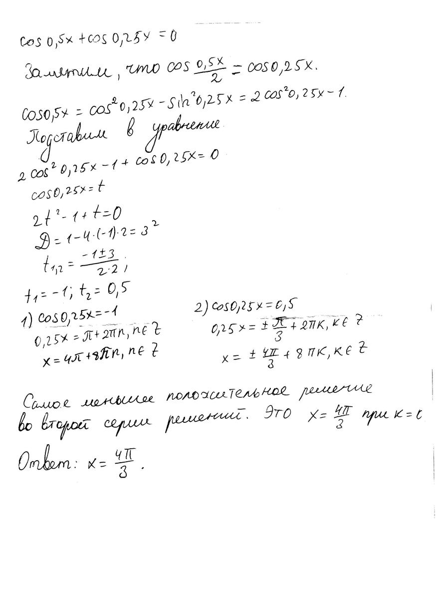 cos 0,5x+cos 0,25x=0 в ответе записать величину наим положительного корня уравнения,выраженную в градусах
