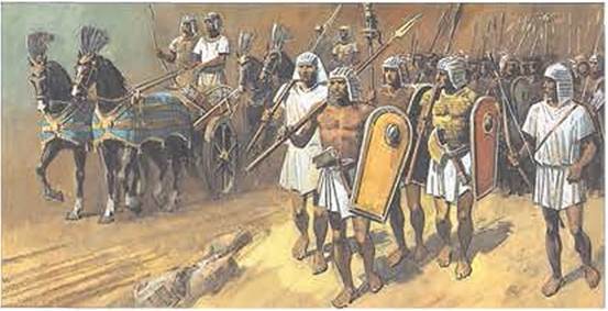 на изображении мы видим войско. это войско наступает. оно продвигается по пескам. слева мы видим цепочку лошадей, в каждом ряду их по паре. лошади одеты - на них голубые накидки. они везут за собой тележки. на тележках сидят по паре людей с копьями. справа идут люди с копьями. у некоторых щиты, у некоторых лук и стрелы. босые, они ведут за собой целое войско людей с такими же оружиями. обсалютно на всех людях вероятнее всего металлические шлемы, защищающие их от удара.
