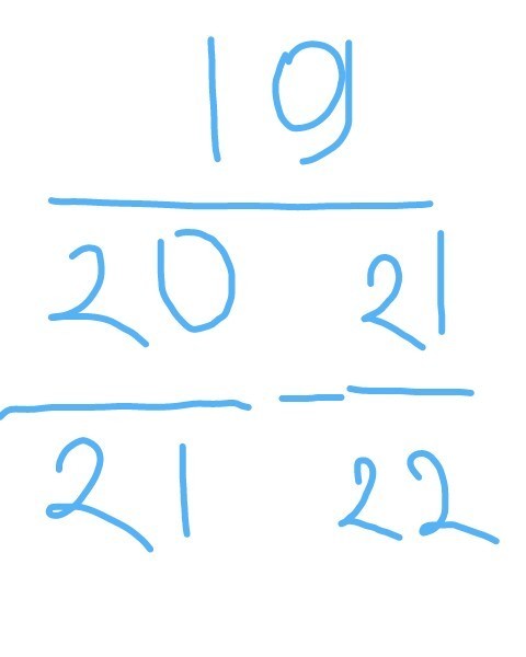 displaystyle dfrac{19}{frac{20}{21} ^{(22} -frac{21}{22} ^{(21} } = dfrac{19}{frac{20cdot 22-21cdot 21}{21cdot 22}} =\\\=19cdot dfrac{(20+1)cdot 22}{20cdot 22-(20+1)cdot 21} =\\\=19cdot dfrac{20cdot 22+22}{20cdot 22-(20cdot 21+21)} =\\\=19cdot dfrac{440+22}{20cdot (22-21)-21} =\\\=19cdot dfrac{462}{20-21} =\\\=(20-1)cdot (-462)=-(9240-462)=\\=-(9000-222)=bold{-8778}