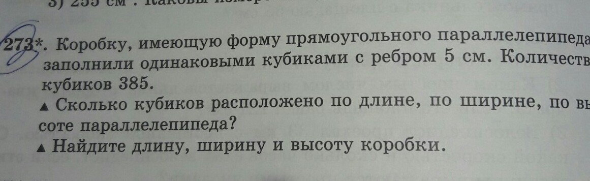 Разложим число 385 на простые множители 385=5*7*11, следовательно получается, что длина = 11 кубиков = 11*5=55 (см) ширина = 7 кубиков = 7*5=35 (см) высота= 5 кубиков = 5*5=25 (см).