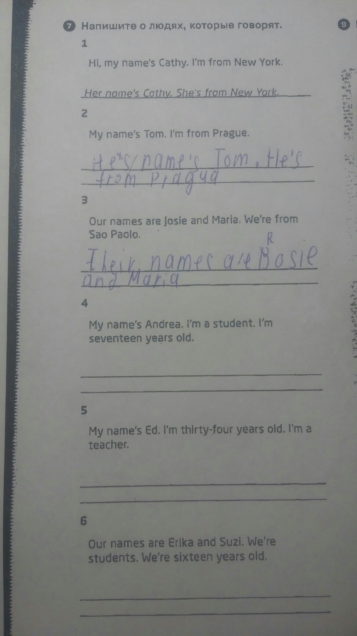 His name Andrea.He is student.He seventeen years old.2.His name Ed.Hethirty-four years old.He is a teacher.3.Theirs names isErika and Suzi. They are students. They are sixteen years old.