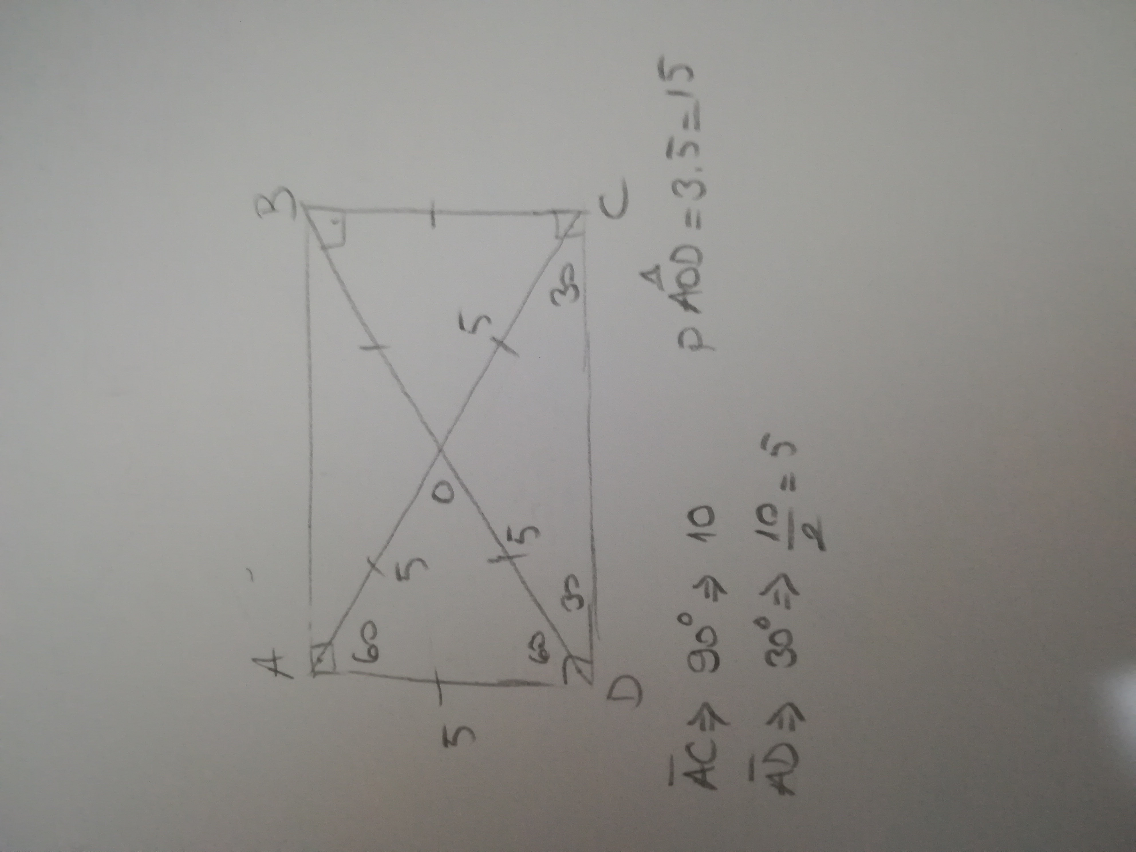 В прямоугольнике ABCD диагонали пересекаются в точке O. Найдите периметр треугольника AOD, если угол ACD=30 градусов, AC=10 см.