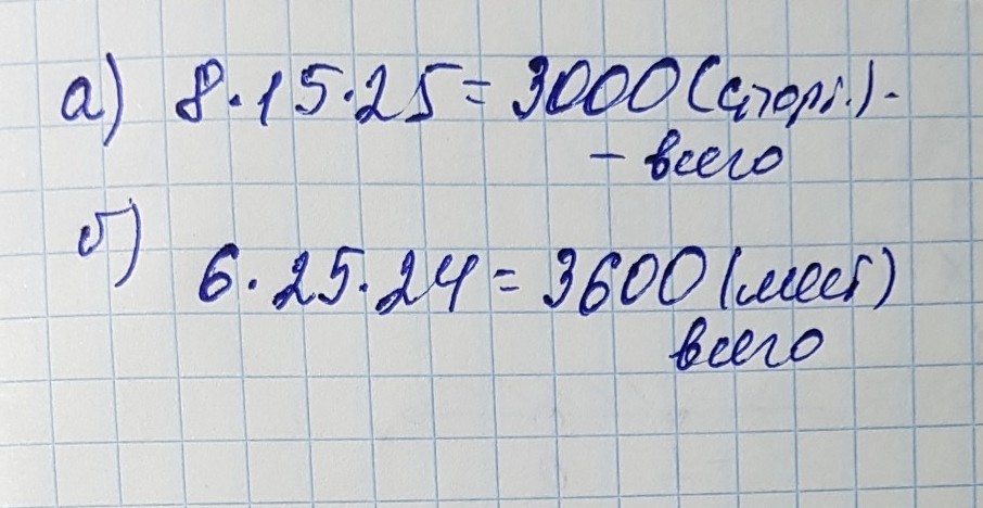 б) В кинотеатре 6 кинозалов. В каждом кинозале 25 рядов по 24 места. Сколько всего зрительских мест в кинотеатре?