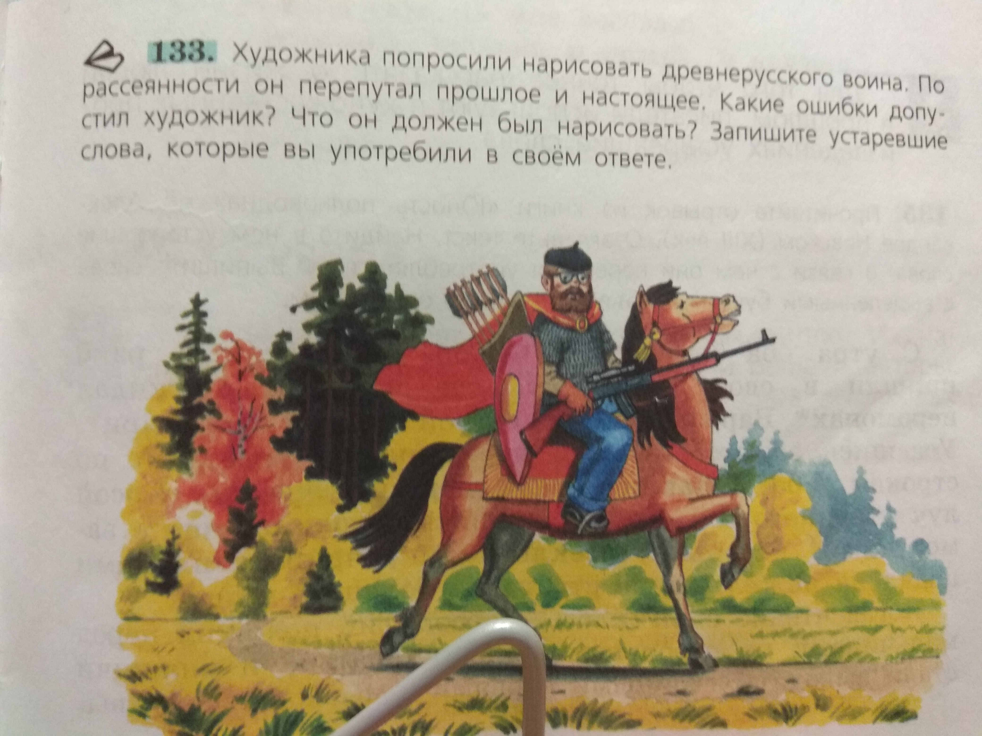Художник изобразил древнерусского воина,но перепутал прошлое и настоящее. Вместо булавы он нарисовал винтовку,вместо шлема - берет, вместо рукавиц перчатки, вместо ботфорт кроссовки, вместо рейтуз джинсы. И очки в те времена не носили. Устаревшие слова: булава, шлем, рукавицы, ботфорты, рейтузы.