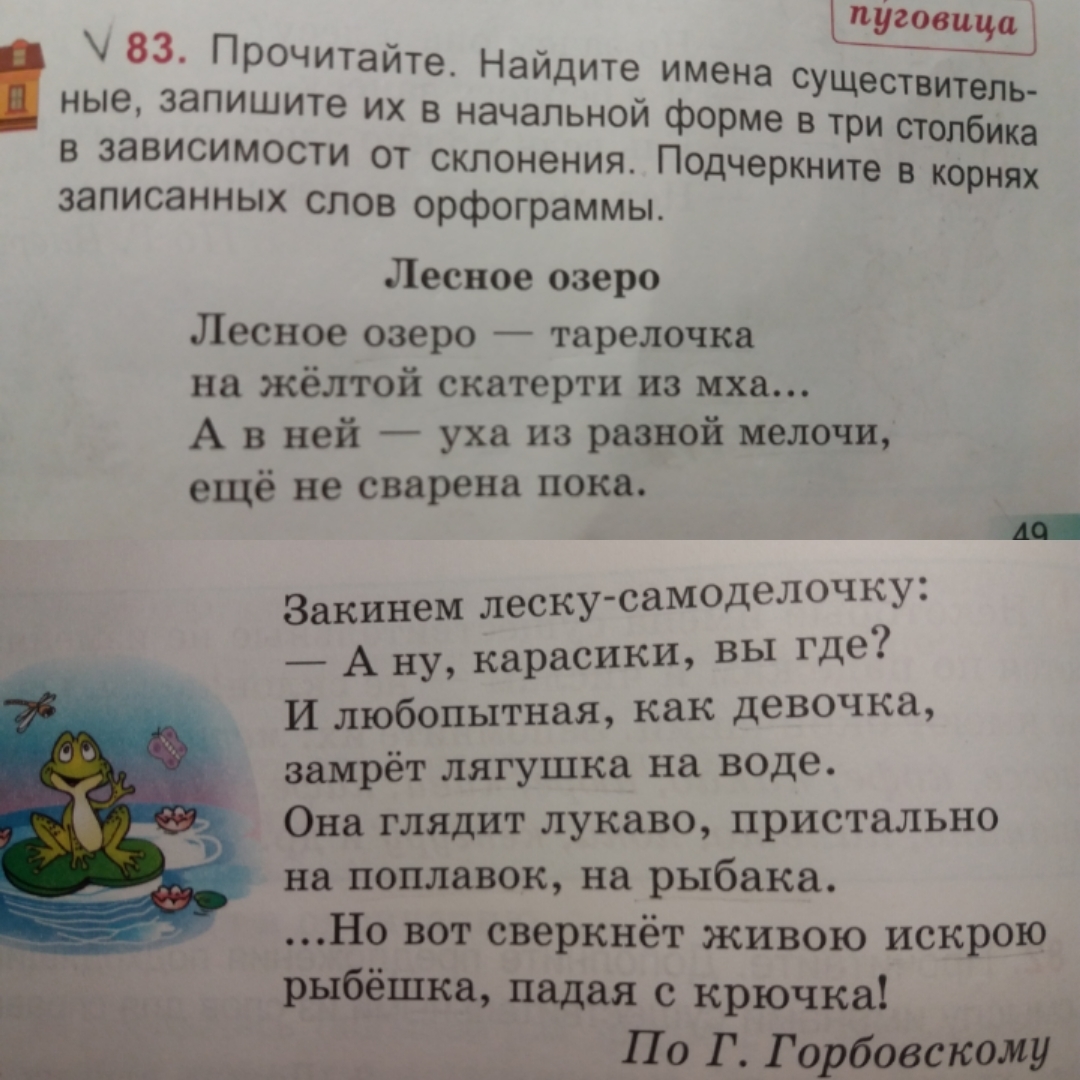 1 склонение (м.р., ж.р. окончания -а, -я): тарелочка, уха, леска-самоделка, девочка, лягушка, вода, искра, рыбёшка.