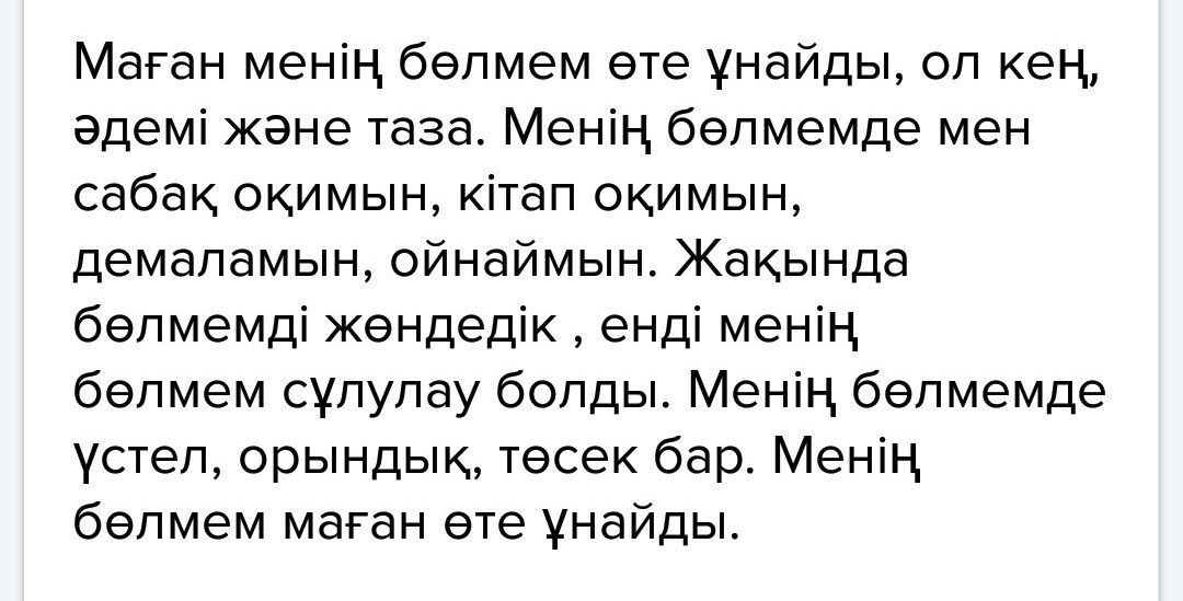Əр адамның өз бөлмесі бар.Менің бөлмем таза,əдемі.Мен бөлмемді таза ұстаймын.Ол менің ұқыптылығымды білдіреді.