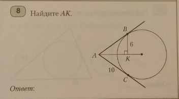 АК = √(АВ² - ВК²) = √(10² - 6²) = √(100 - 36) = √64 = 8