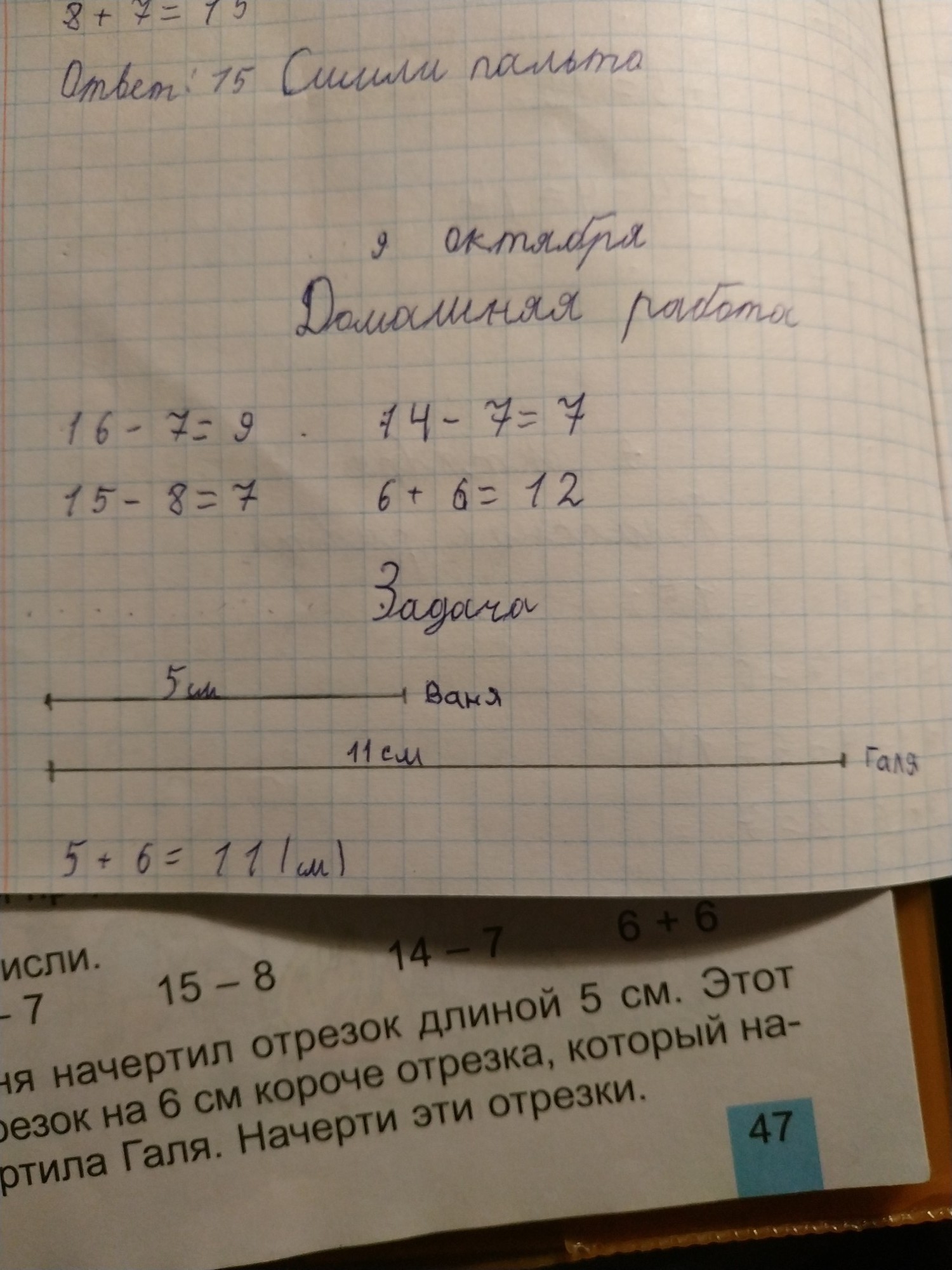 Помогите решить задач пожалуйста:Ваня начертил отрезок длиной 5см.этот отрезок на 6 см короче отрезка,который начертила Галя.начерти эти отрезки.