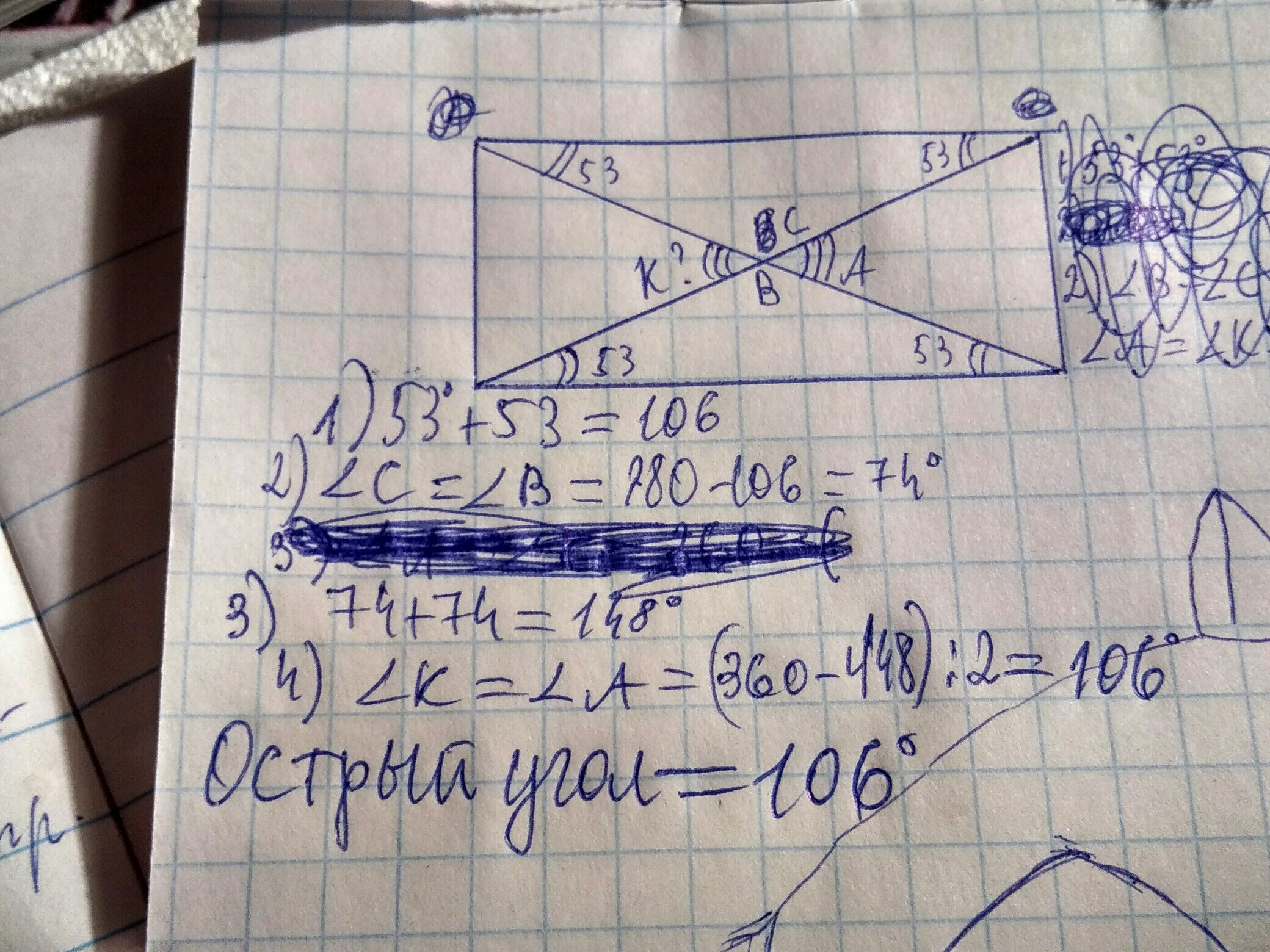 Найти острый угол между диагоналями прямоугольника,если его диагональ образует с стороной угол 53°.