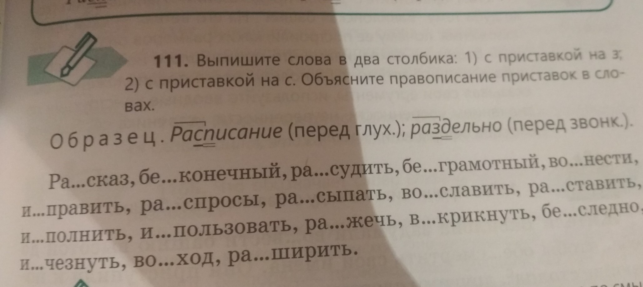 Рассказ(перед глухим), бесконечный(перед глухим), рассудить(перед глухим), безграмотный(перед Звонким), вознести(перед Звонким), расспросы(перед глухим), рассыпать(перед глухим), восславить(перед глухим), расставить(перед глухим), исполнить(перед глухим), использовать(перед глухим), разжечь(перед звонким), вскрикнуть (перед глухим), бесследно(глухой), исчезнуть(глухой), восход(глухой,), расширить(глухой)