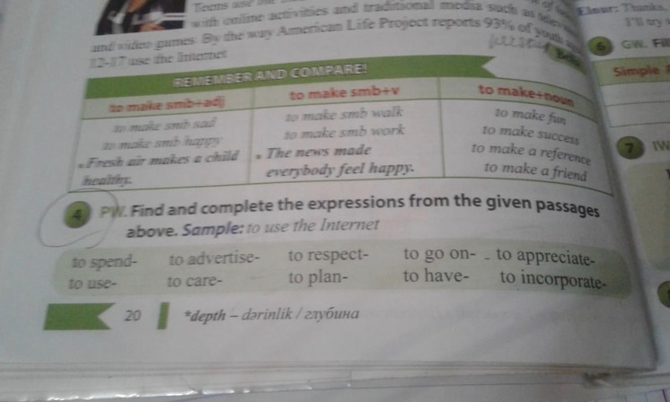 To spend time; to use the web; to advertise shampoo; to care about animals; to respect woman; to plan the weekend; to go on picnic; to have barbecue; to appreciate parents; to incorporate ingredients.
