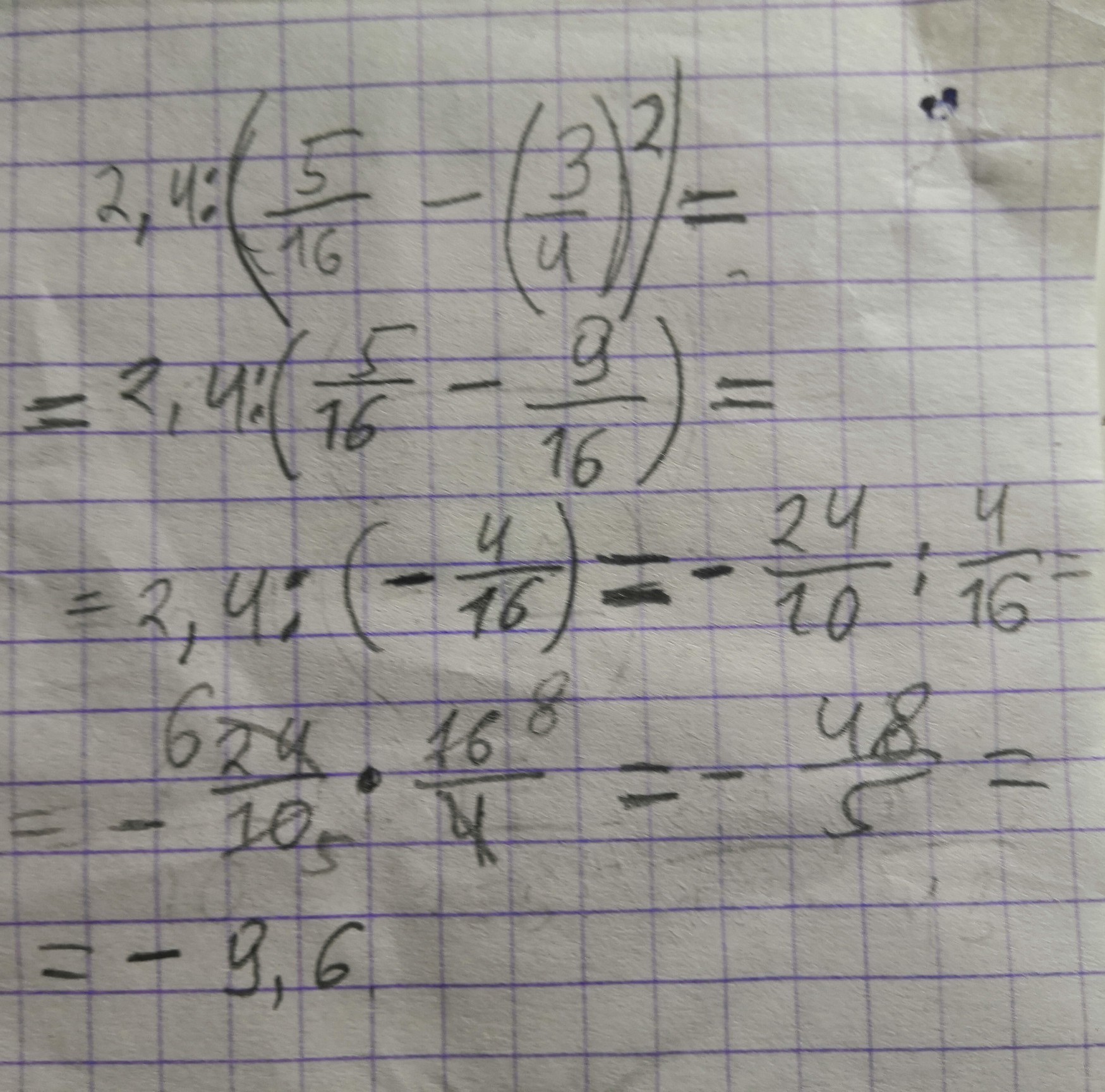 2,4:(5/16-(3/4))²=2,4:(5/16-12/16)²=2.4:(-7/16)²=2,4:49/256=12 132/245